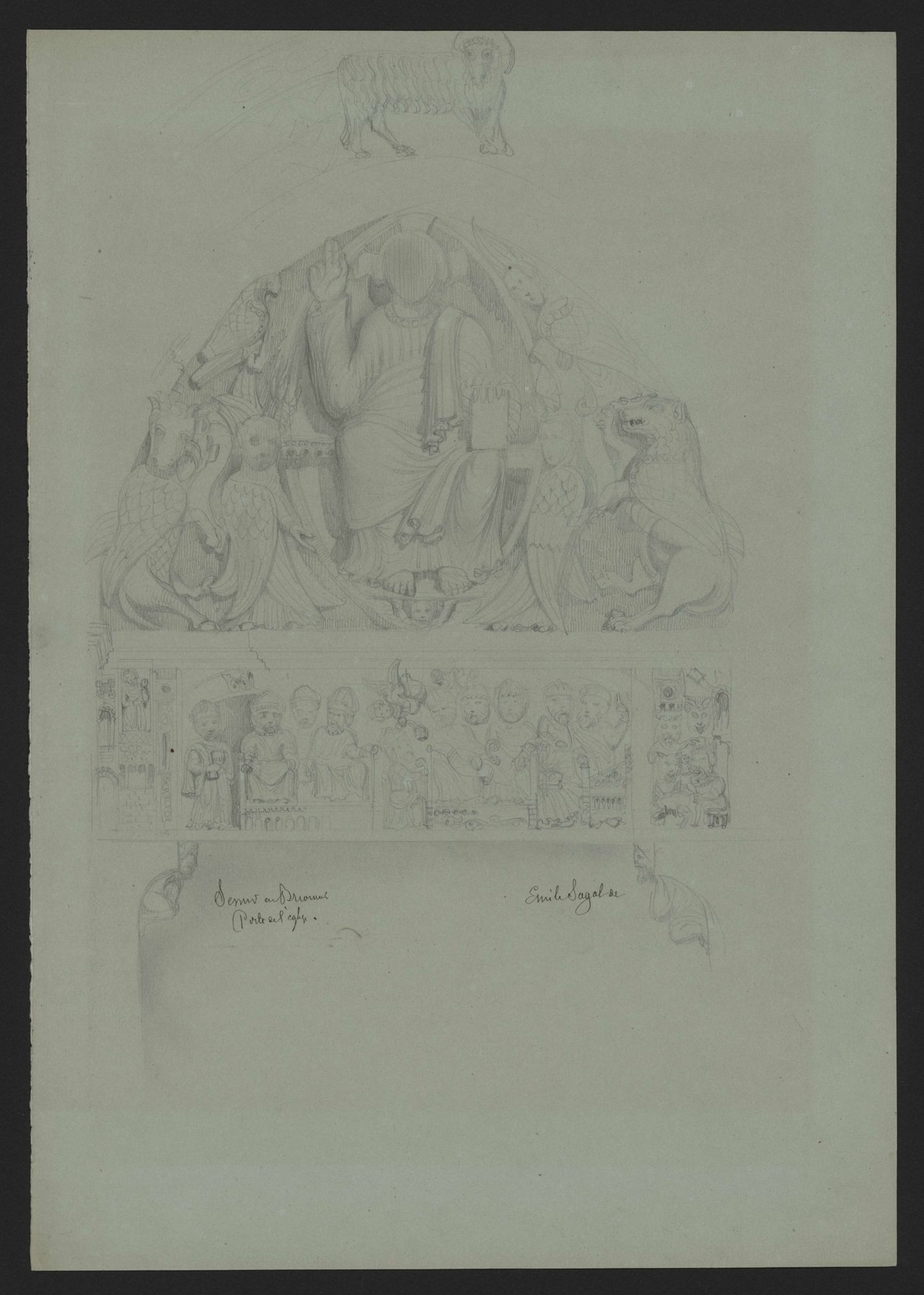 Semur-en-Brionnais, portail de l'église, tympan "légende de Saint-Hilaire" : comparaison entre une carte posale et le dessin d'Emile Sagot (faire glisser le ligne verticale), et en-dessous, images pleine page.
