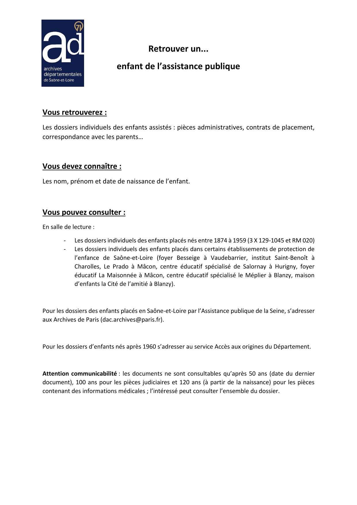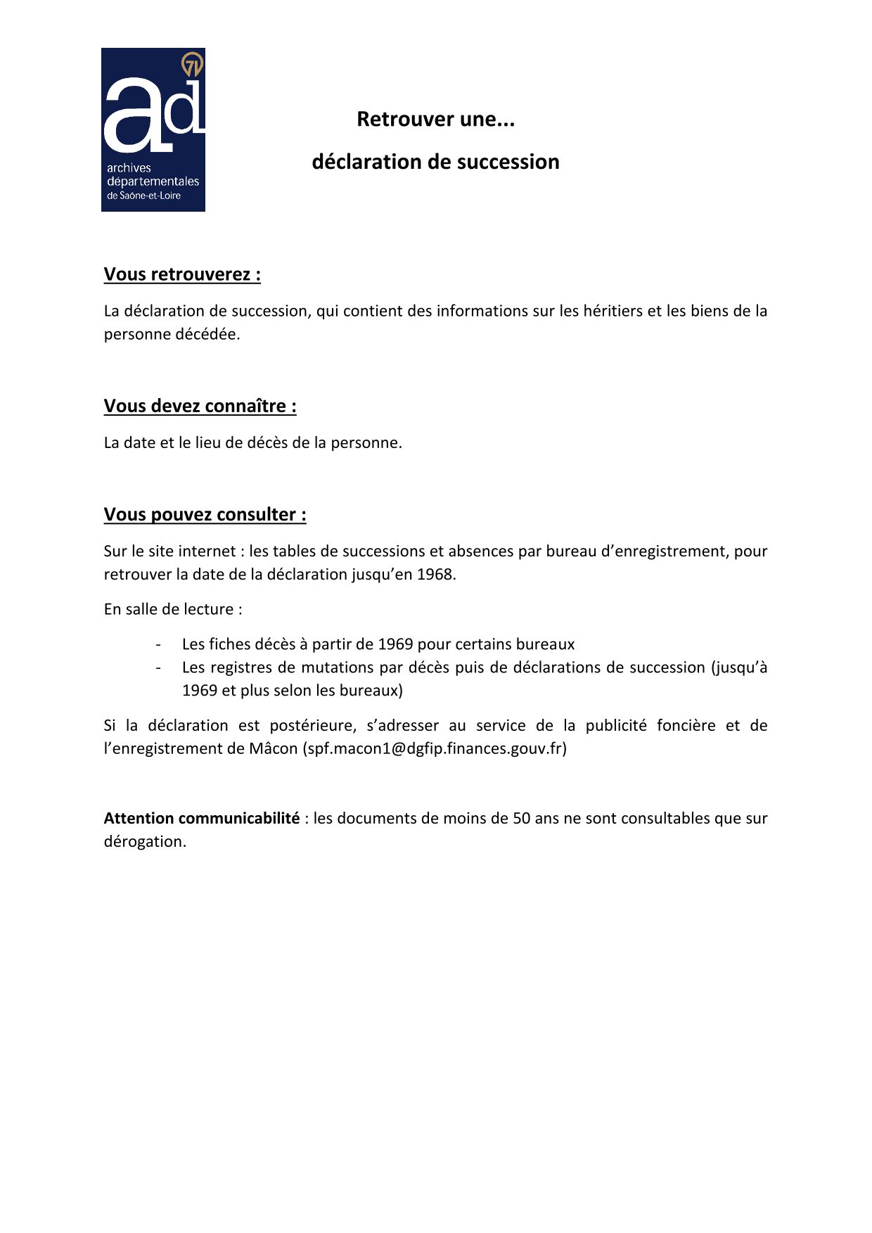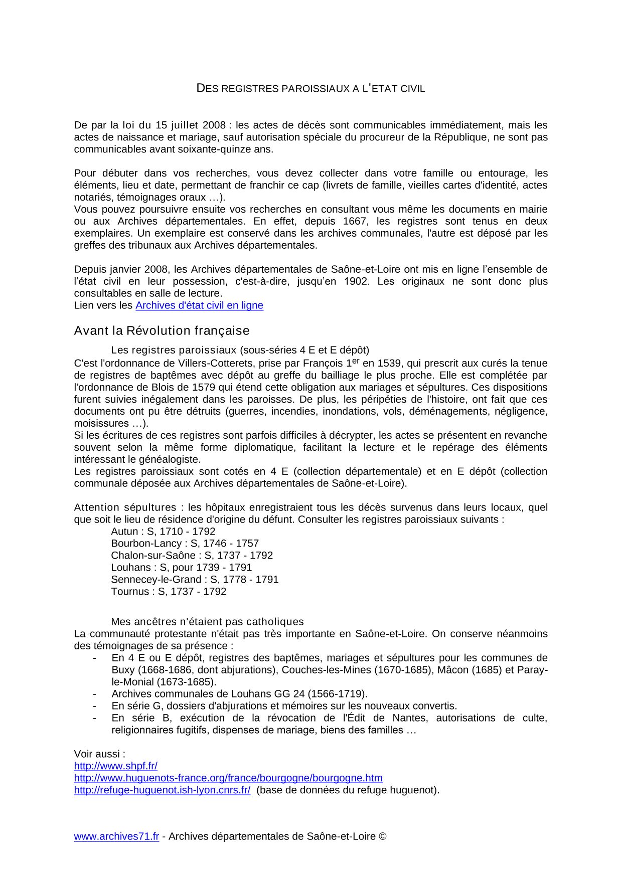 Les documents de l'état civil enregistrant les naissances, les mariages et les décès des individus, les recensements de population - périodiques depuis le XIX° siècle - donnant le nombre et la liste nominative des habitants par commune, les actes passés devant les notaires ou encore les documents de l'armée constituent les principales sources - mais pas les seules - auxquelles puiser des renseignements sur les Saône-et-Loiriens qui nous ont précédés.