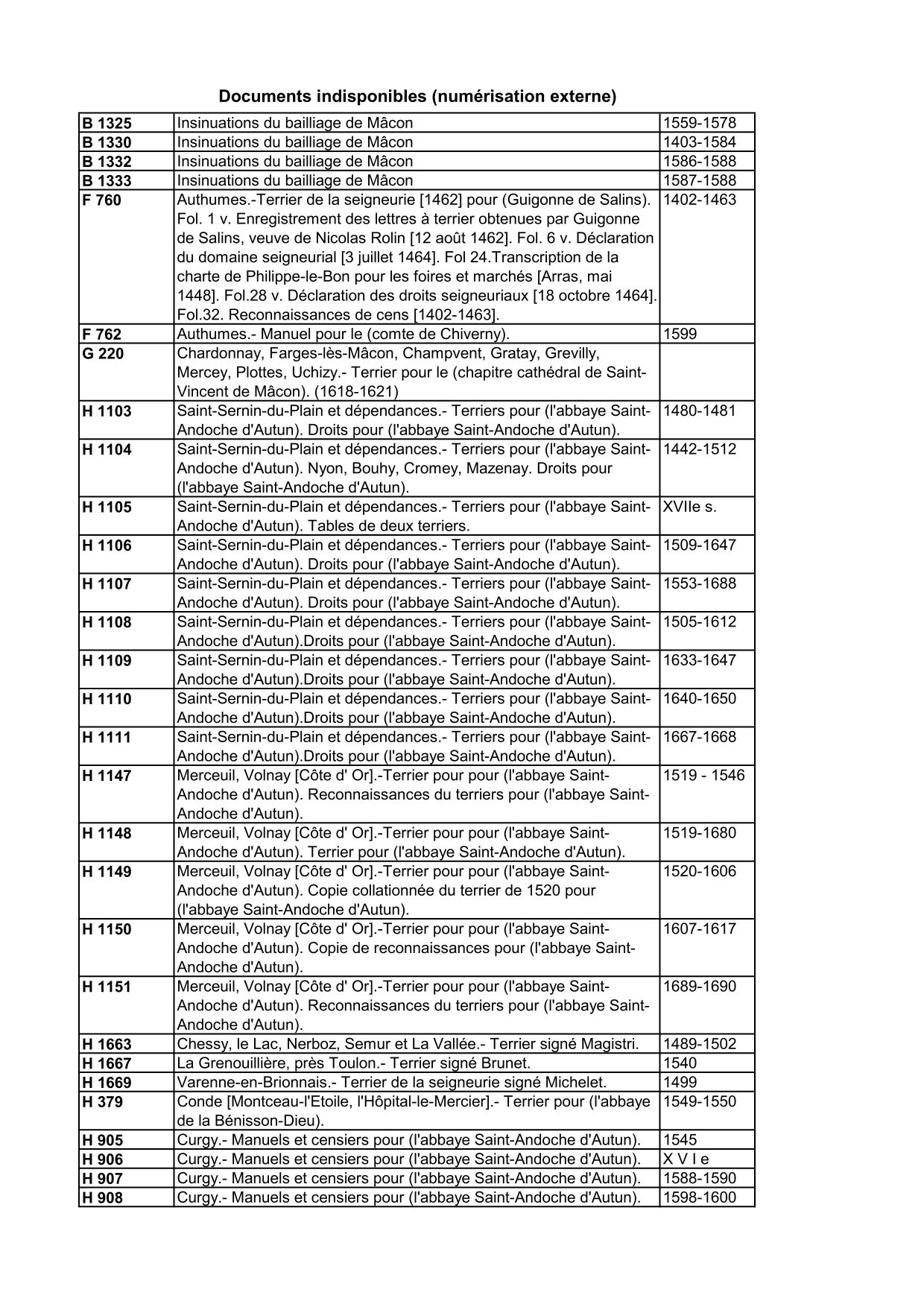 Nous vous informons qu'en raison de différents campagnes de restauration, numérisation et de dépoussiérage et de reconditionnement les cotes suivantes sont indisponibles :