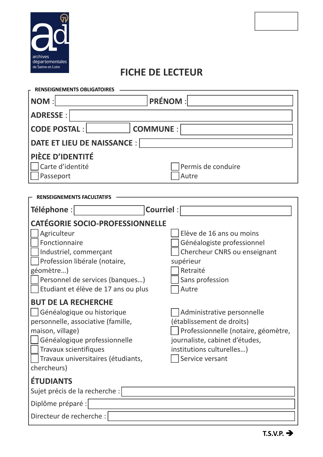 Vous pouvez vous préinscrire en complétant et en retournant le formulaire ci-dessous à l'adresse accueil-archives@saoneetloire71.fr .