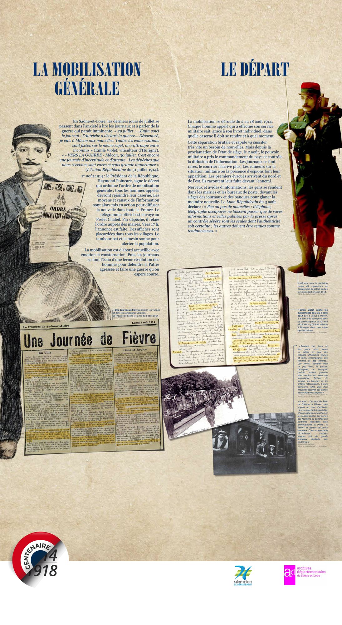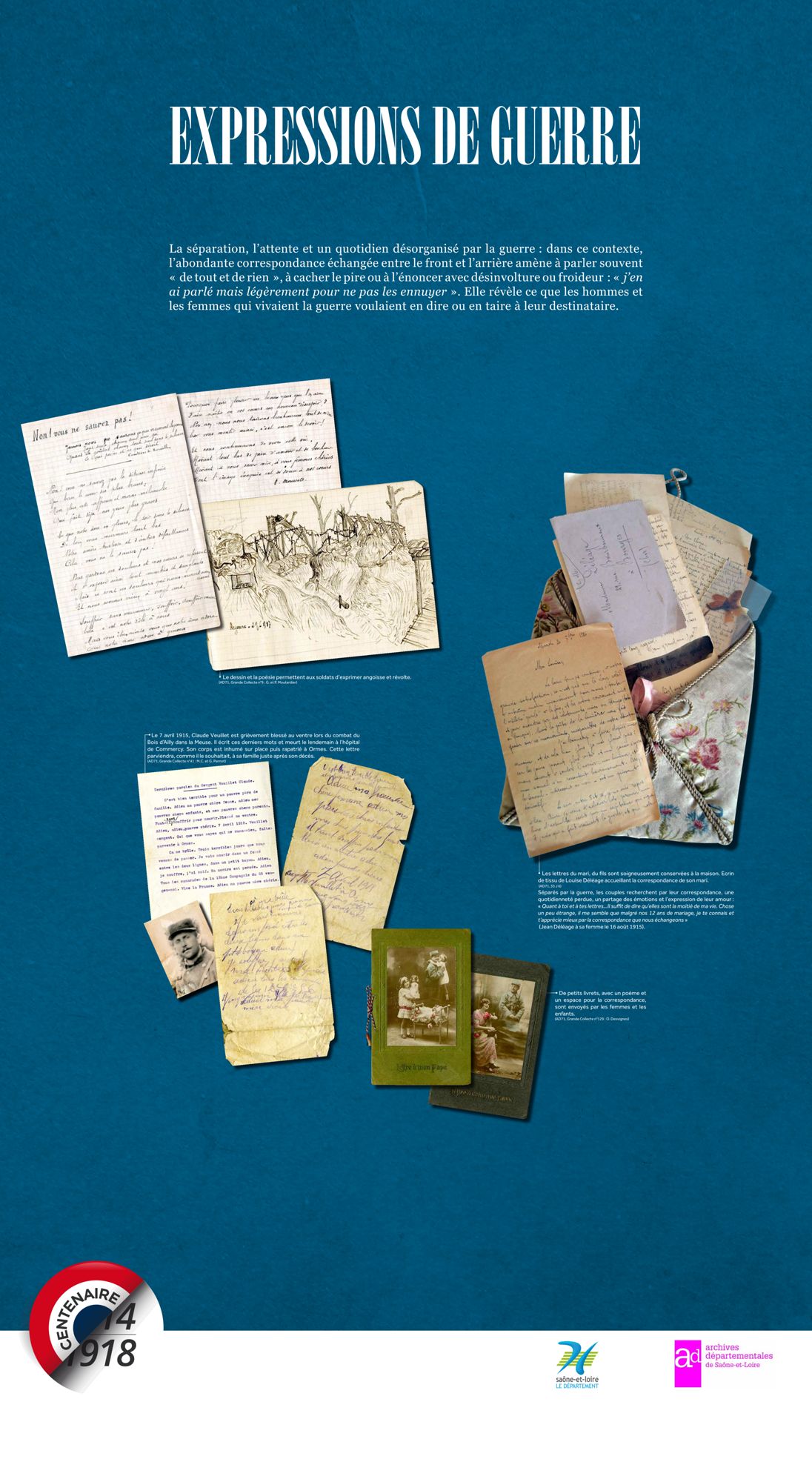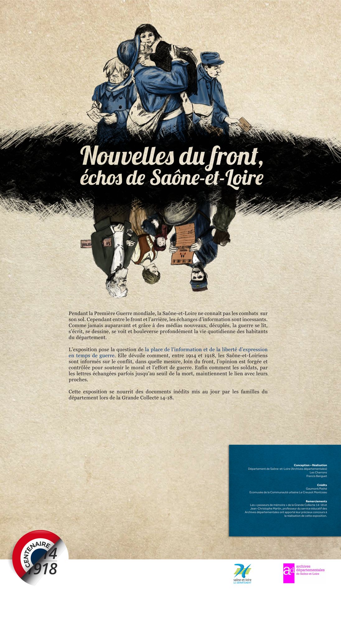 Les Archives départementales vous proposent de consulter, ci-dessous, la version itinérante de leur exposition "Nouvelles du front, échos de Saône-et-Loire" labellisée par le Ministère de la Culture dans le cadre du Centenaire de la Grande Guerre.