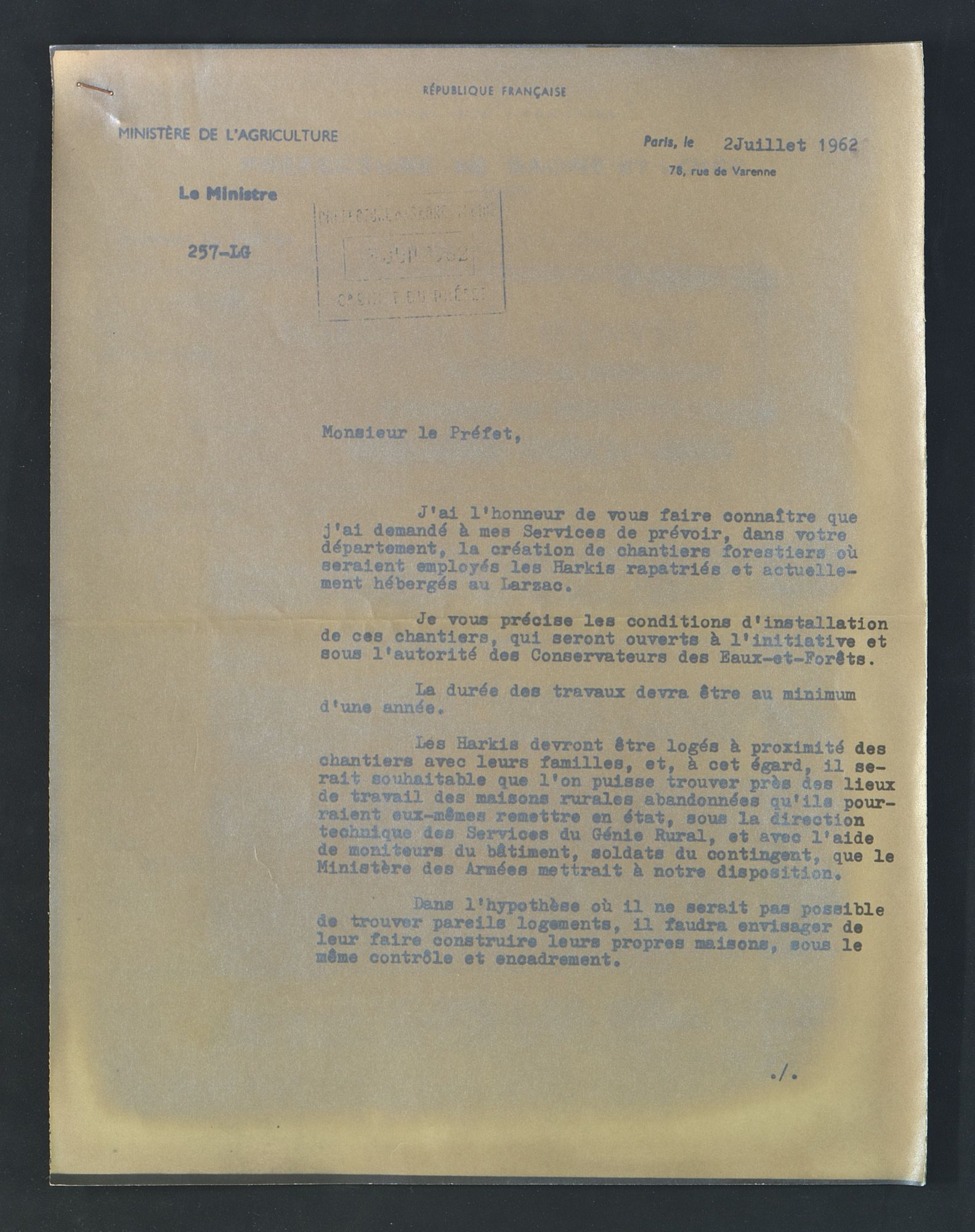 Courrier datant du 2 juillet 1962 du ministère de l’Agriculture contactant les différents Préfets pour les prévenir de la création de chantiers forestiers, où seraient employés les harkis rapatriés. Il précise que les conditions d’installation de ces chantiers sont ouvertes à l’initiative et sous l’autorité des Conservateurs des Eaux-et-Forêts. La durée des travaux devra être au minimum d’une année et les harkis doivent être logés à proximité des chantiers avec leurs familles. En outre, est soumise l’idée de les loger dans des maisons rurales abandonnées qu’ils devraient eux-mêmes remettre en état ou si de tels logements ne sont pas disponibles, la possibilité de faire construire aux harkis leurs propres maisons.