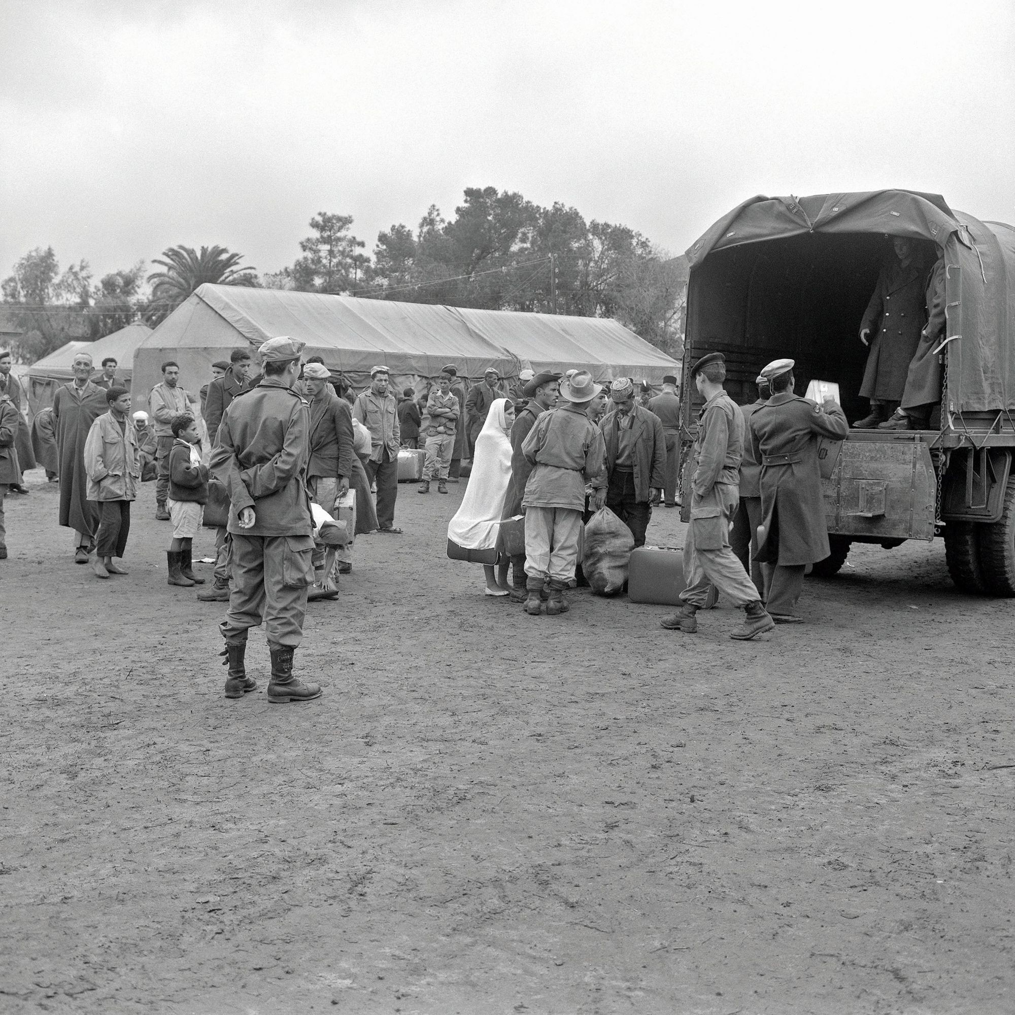 Photographie du regroupement de harkis et de leurs familles à Bone. Le jour du départ, les militaires français du 26e Régiment d’infanterie motorisée (RIM) aident les familles à se hisser dans les camions venus les chercher pour les rapatrier. En effet, face à l’insécurité et à la menace, en particulier du FLN (Front de Libération Nationale), de nombreuses familles cherchent une protection auprès de l’armée.