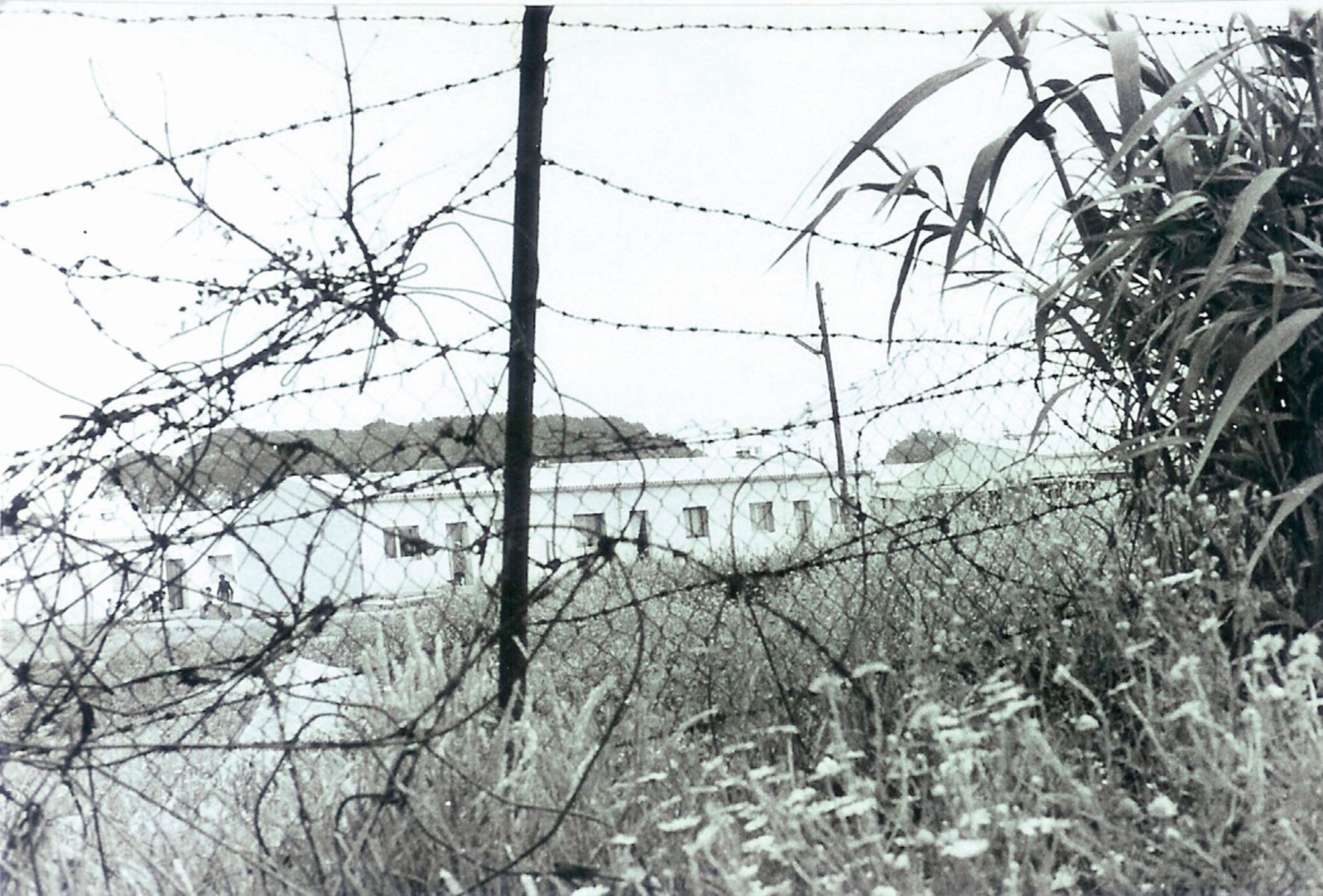 Photographie du camp de Saint Maurice l’Ardoise situé dans le Gard. Celui-ci s’étend sur un terrain de 15 hectares entouré d’un double grillage de barbelés au-delà duquel s’étire un no man’s land de broussailles de plus de 50 mètres de large. Il devient le 4ecamp de harkis ouvert en France, le 29 octobre 1962, après ceux du Larzac, de Bourg-Lastic et de Rivesaltes, où les anciens supplétifs et leurs familles étaient « rassemblés en attendant leur recasement ultérieur en France ». Le 5 janvier 1963, il atteint son effectif maximum avec 5 542 personnes dont 2 246 hommes, 1 082 femmes et 2 214 enfants. Initialement, ces centres ont un caractère transitoire avec un encadrement militaire, cela dans un double objectif : le reclassement et la sécurité des familles d’anciens supplétifs. Ce camp est alors d’abord considéré comme un « camp de transit » puis au début de l’année 1965, il devient une « cité d’accueil et d’hébergement » pour les personnes jugées « incasables » ou « irrécupérables » tels veufs ou veuves ou encore les infirmes, par exemple.