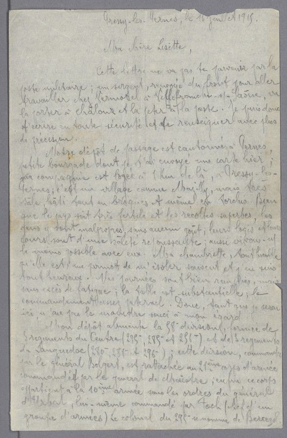 Notre dépôt de passage est cantonné à Pernes, petite bourgade dont je t’ai envoyé une carte hier ; ma compagnie est logée à 1 Km de là, à Pressy-les-Pernes ; c’est un village comme Mazilly, mais très sâle, bâti tout en briques et même en torchis. Bien que le pays soit très fertile et les récoltes superbes, les gens y sont malpropres, sans aucun goût ; leurs logis et leur cours sont d’une sâleté repoussante ; aussi vivons-ns le moins possible avec eux. Ma chambrette, tout humble qu’elle est, me permet de m’isoler souvent et j’en suis tout heureux. Nos journées sont bien remplies, mais sans excès de fatigue ; la table est substantielle ; le commandement assez paternel. Donc, tant que je serai ici, n’aie pas le moindre souci à mon égard.