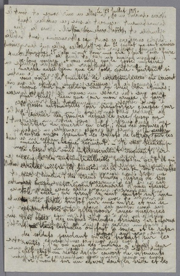 Vos lettres du 22 juillet me sont arrivées le dimanche 25 ; elles n’ont donc mis que 3 jours pour faire ce long voyage, et vous voyez que la poste militaire marche aussi bien que la poste civile. Pourtant si vous voyiez la quantité de correspondances qui arrivent chaque jour aux soldats vous en seriez bien étonnés ; ainsi tenez, rien que pour mon armée, il faut 60 grosses automobiles pour transporter chaque jour le courrier des troupes depuis la gare jusqu’au quartier du général en chef ; puis des voitures et d’autres autos prennent les ballots de lettres au quartier pour les amener dans chaque régiment.- Je vois beaucoup de choses qui vous intéresseraient vivement : par exemple des automitrailleuses peintes en vert et qui, arrêtées contre les buissons de la route, sont invisibles pour l’ennemi ; des trains blindés, chargés de très gros canons entièrement recouverts d’une épaisse tôle d’acier, qui tirent la nuit tantôt sur une voie ferrée, tantôt sur une autre et qui se retirent très vite après avoir lancé quelques gros obus ; des cuisines roulantes, traînées par 2 chevaux et dans lesquelles ont fait la soupe et le rata des soldats pendant qu’elles trottent sur les routes ; j’ai vu aussi des Indiens à cheval, leur chef était un riche rajah couvert de vêtements d’or, monté sur un cheval dont la bride et les