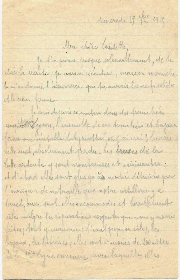 Je suis depuis ce matin dans des tranchées conquises depuis 2 jours, l’ensemble de ces tranchées et boyaux forme un véritable « labyrinthe », où j’ai erré 3 heures cette nuit, absolument perdu. Les traces de la lutte ardente y sont nombreuses et saisissantes ; et d’abord elles sont plus qu’à moitié détruites par l’ouragan de mitraille que notre artillerie y a lancé, aussi sont-elles incommodes et horriblement sâles malgré les réparations urgentes que nous y avons faites ; tout y manque : l’eau (propre ou sâle), les boyaux, les latrines ; elles sont à moins de 200 mètres de la 1ère ligne ennemie, avec laquelle elles