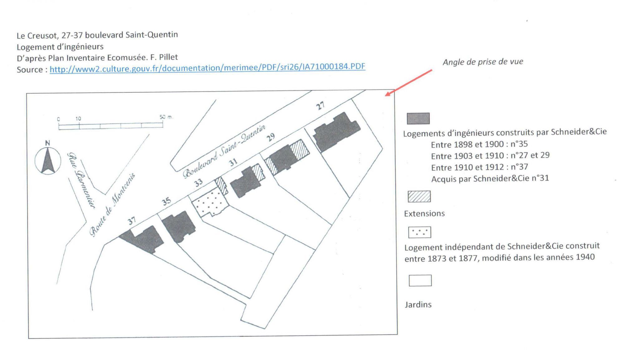 « Entre 1898 et 1912, les Etablissements Schneider érigent quatre pavillons pour le logement des ingénieurs. Jusqu’alors logés dans des bâtiments disséminés dans la ville, ils sont ici regroupés le long du boulevard Saint-Quentin. A quelques dizaines de mètres subsistent à cette époque les plus anciennes casernes du Creusot, dites des "Alouettes", datant de la fin du XVIIIe siècle. Tout tend à distinguer ces pavillons de leur environnement : bâtiments non plus alignés sur la rue mais en retrait derrière des murs de clôtures dotés de grilles, parcs ou grands jardins, remises, toits d’ardoise… On est en présence d’une architecture de villégiature, sobre, mais où s’affirme le statut particulier des occupants. […]
