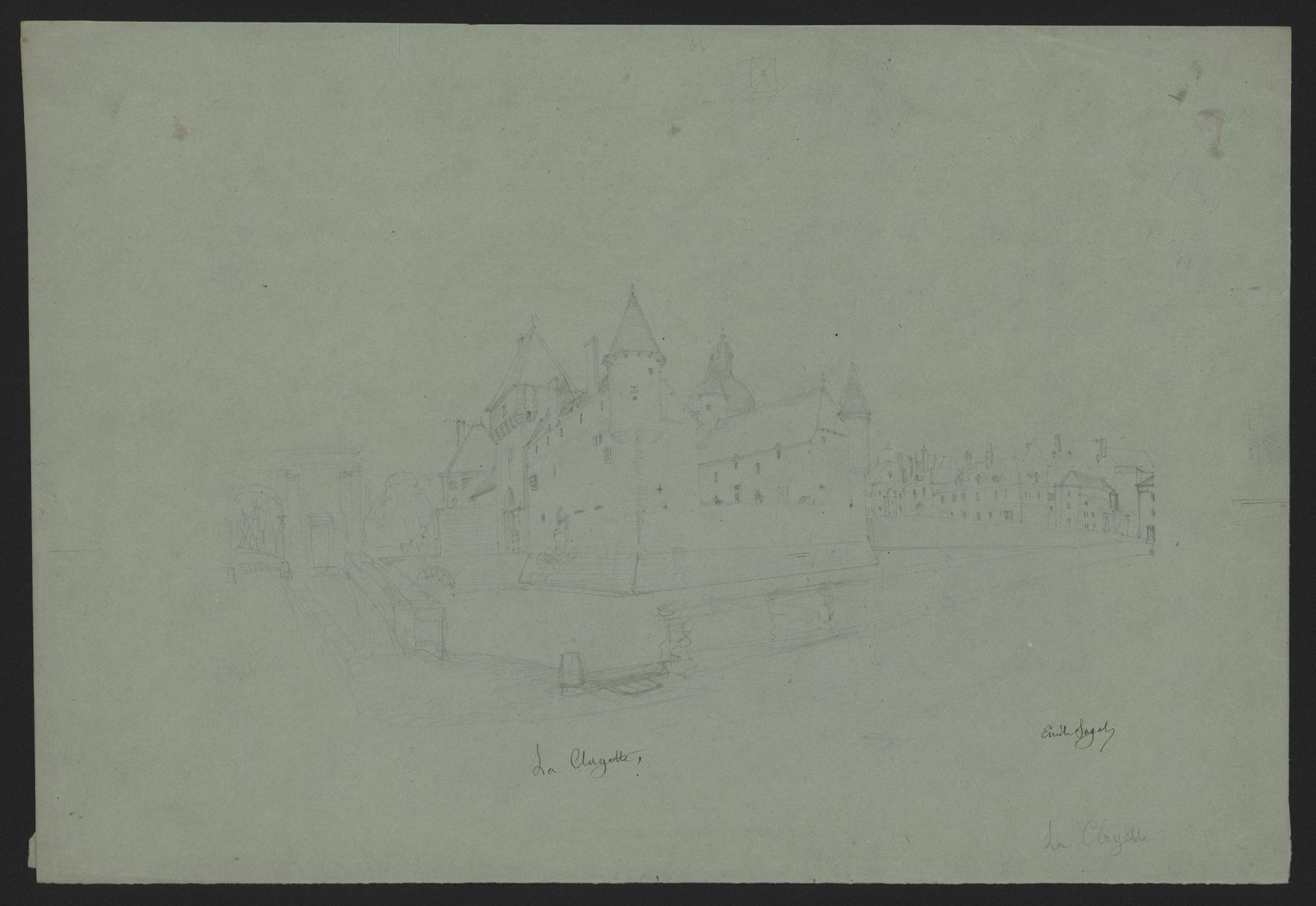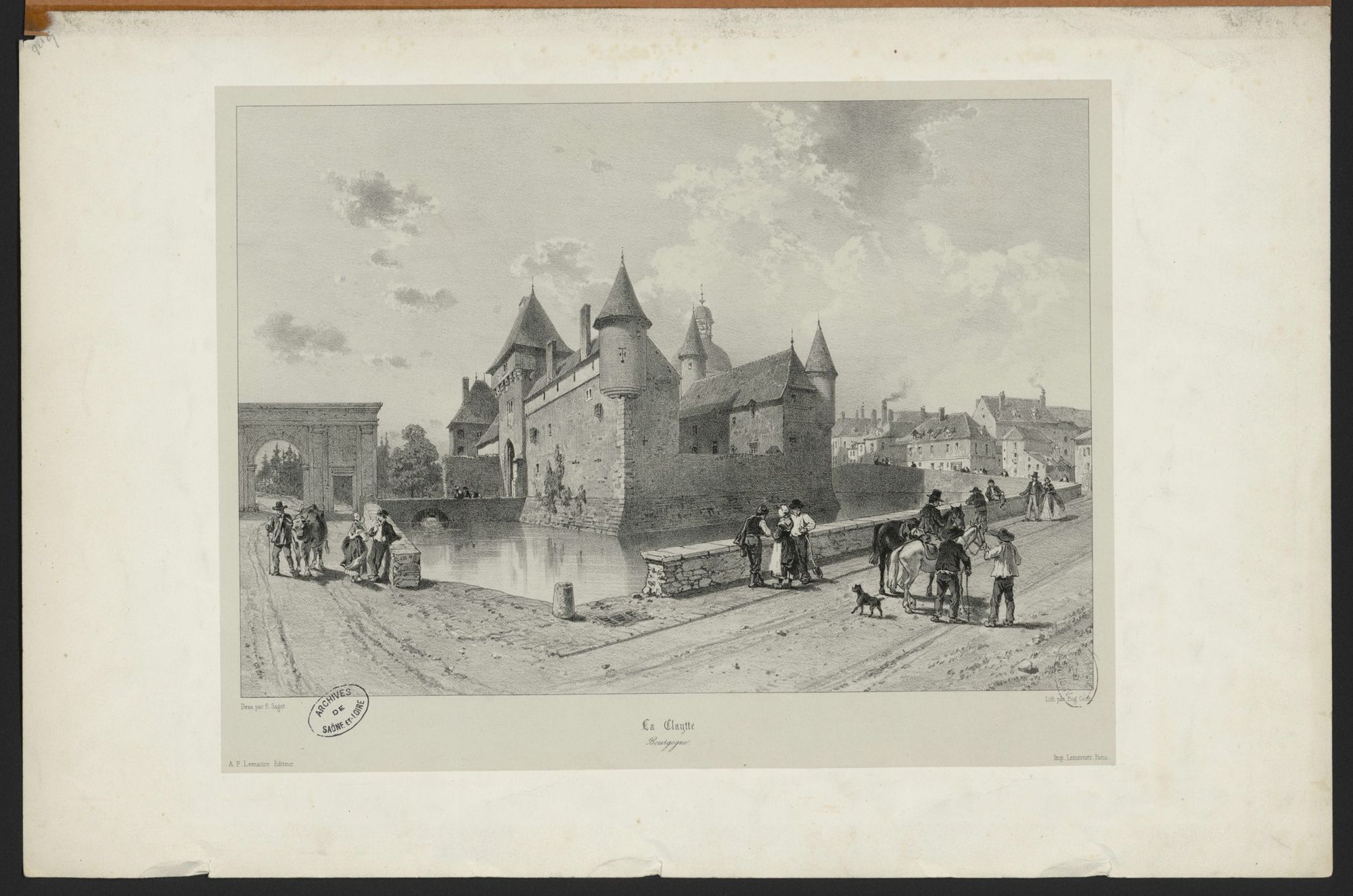 La Clayette, vue générale et château : comparaison entre l'esquisse et l'estampe finale d'Emile Sagot (faire glisser le ligne verticale), et en-dessous images pleine page.