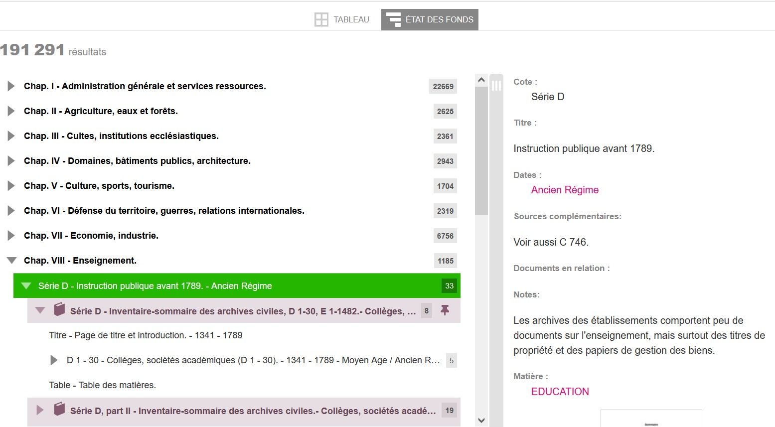 "Etats des fonds" : mode d'affichage en arborescence des fonds d'archives. Chaque unité est liée à l'ensemble dont elle fait partie.