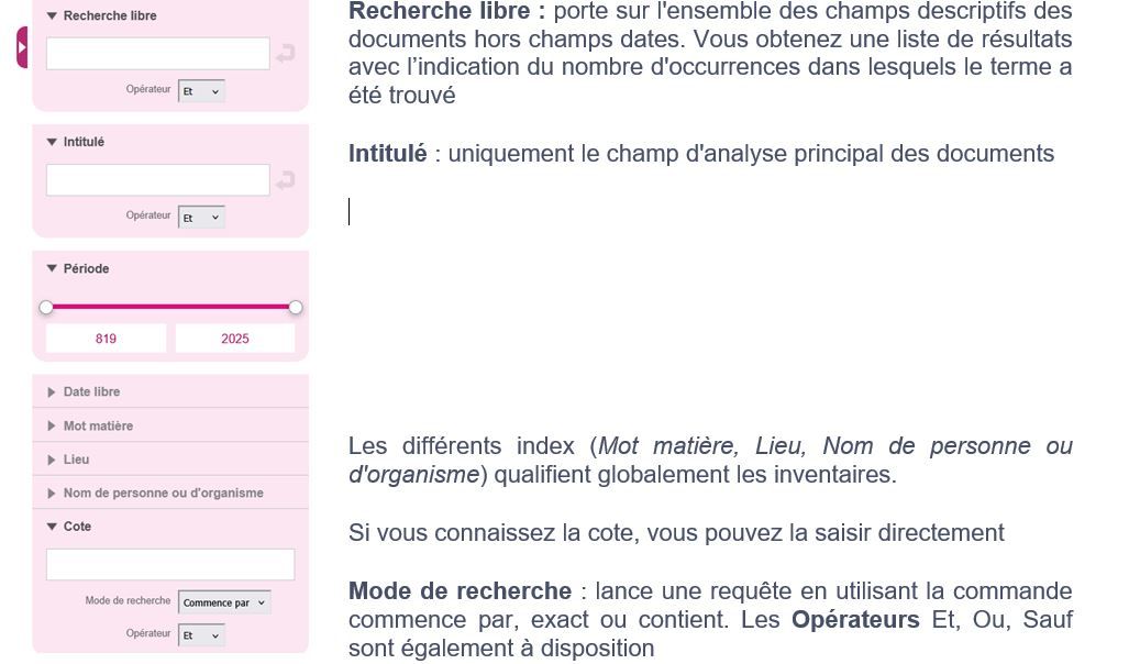 Si vous ne savez pas précisément où chercher dans l'Etat des fonds, vous pouvez interroger l'intégralité des notices à l'aide d'une série de filtres, disponibles à droite de l'écran.