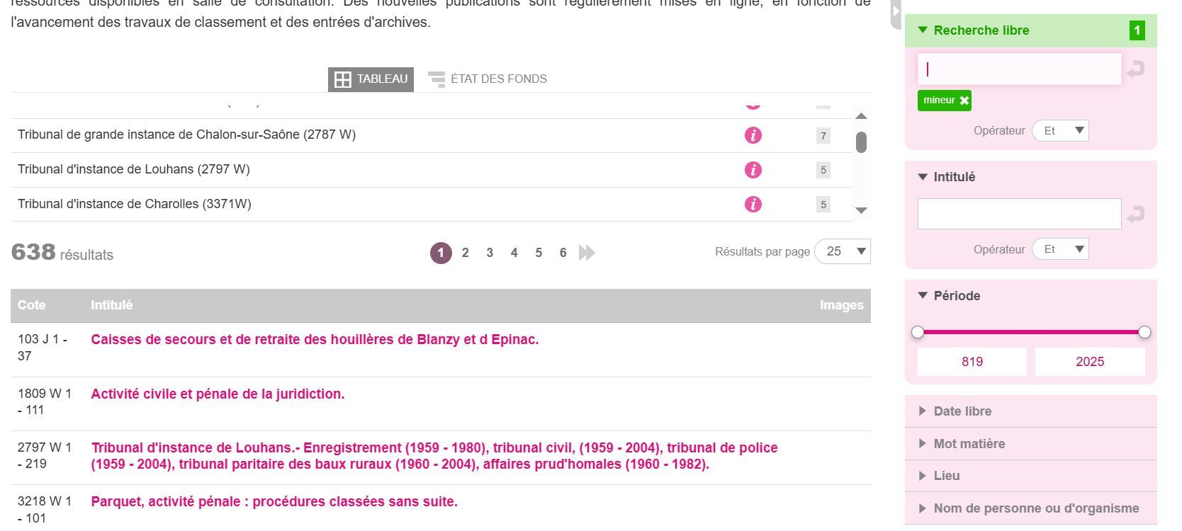 Un fonds d'archives est constitué d’un ensemble de documents, organisé en dossiers, produit par un organisme, un service, une famille, une personne... L'état des fonds est un outil de recherche structuré qui décrit, par fonctionnalité et toutes époques confondues, l'ensemble des ressources conservées aux Archives départementales de Saône-et-Loire converties en format électronique.