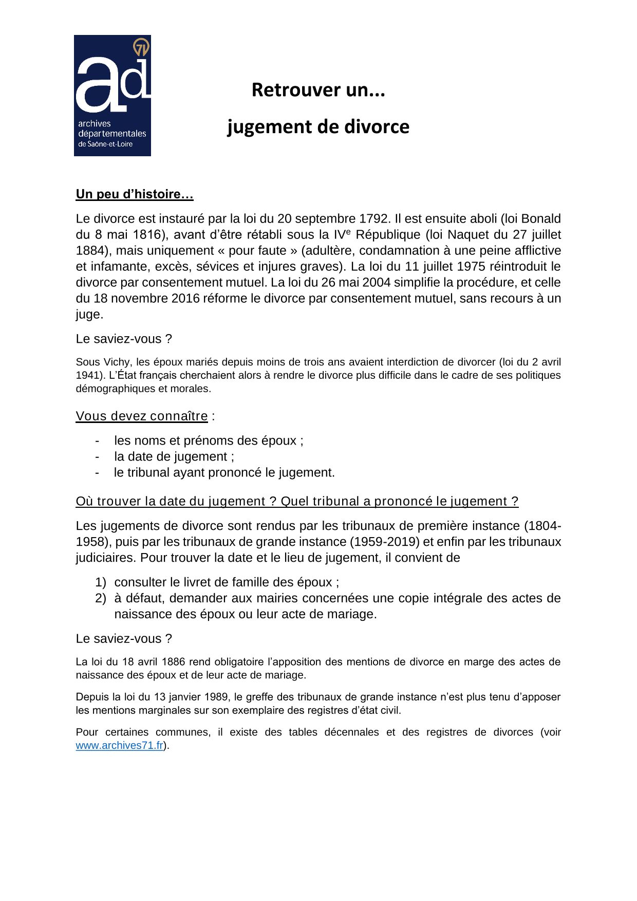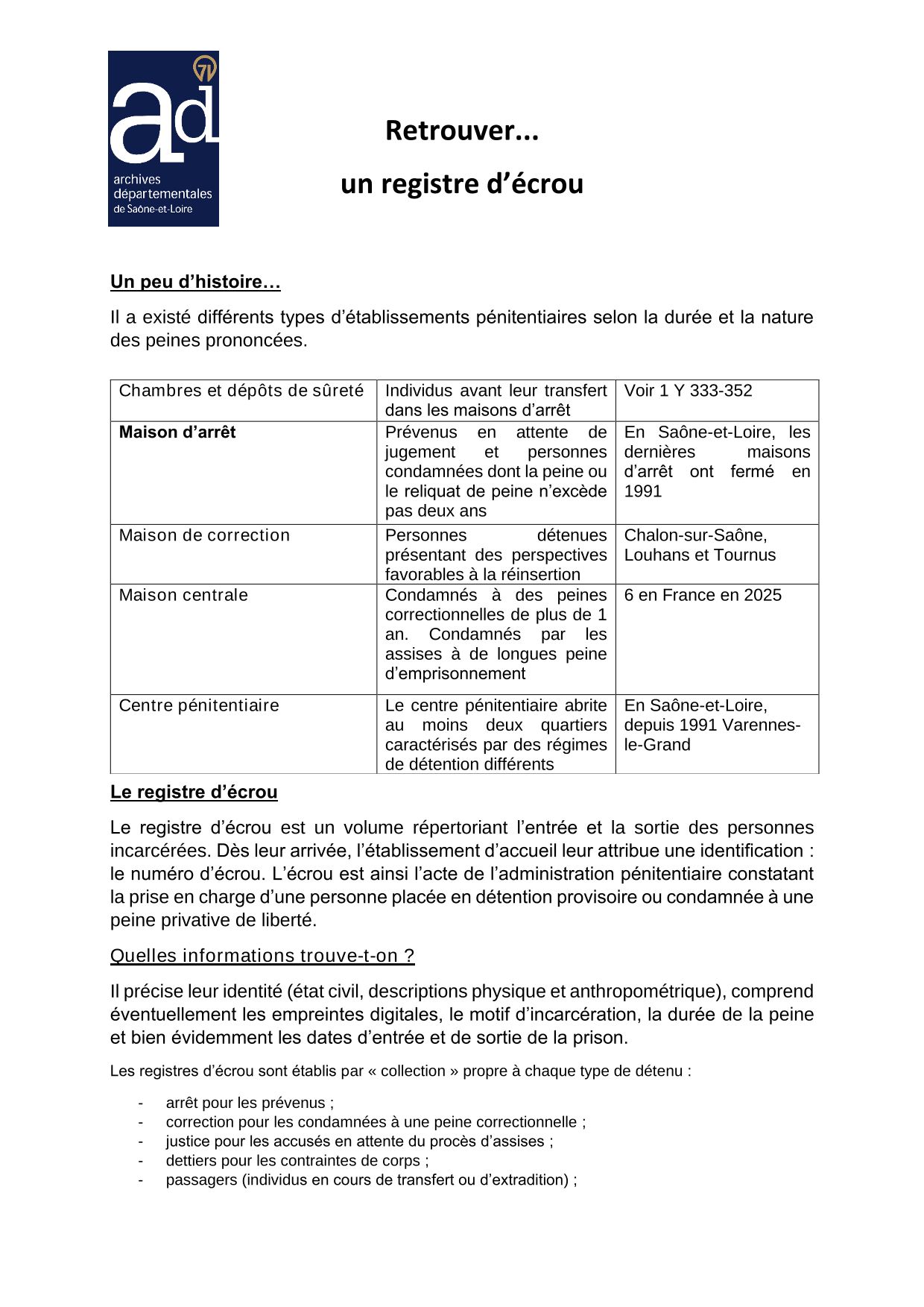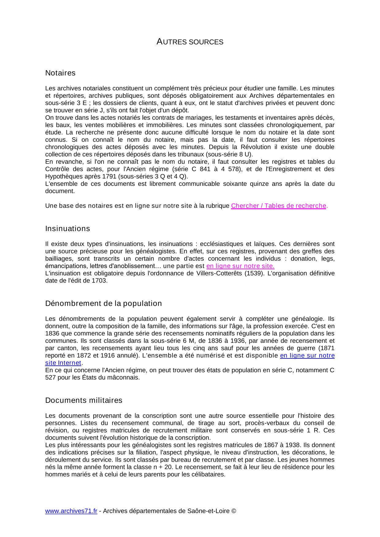 Les documents de l'état civil enregistrant les naissances, les mariages et les décès des individus, les recensements de population - périodiques depuis le XIX° siècle - donnant le nombre et la liste nominative des habitants par commune, les actes passés devant les notaires ou encore les documents de l'armée constituent les principales sources - mais pas les seules - auxquelles puiser des renseignements sur les Saône-et-Loiriens qui nous ont précédés.