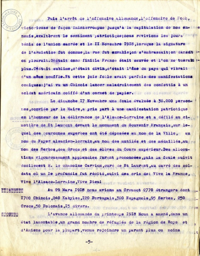 Partout en France, une clameur de joie traverse le pays, d’autres écrits illustrent l’enthousiasme du moment à l'arrière au Creusot : « lorsque la signature de l’armistice fut connue, la rue fut envahie ; on s’embrassait ; on dansait, on pleurait. C’était donc fini ! La France était sauvée et l’on ne tuerait plus » note Pierre Ferrier, secrétaire général de la mairie du Creusot dans ses souvenirs de guerre.