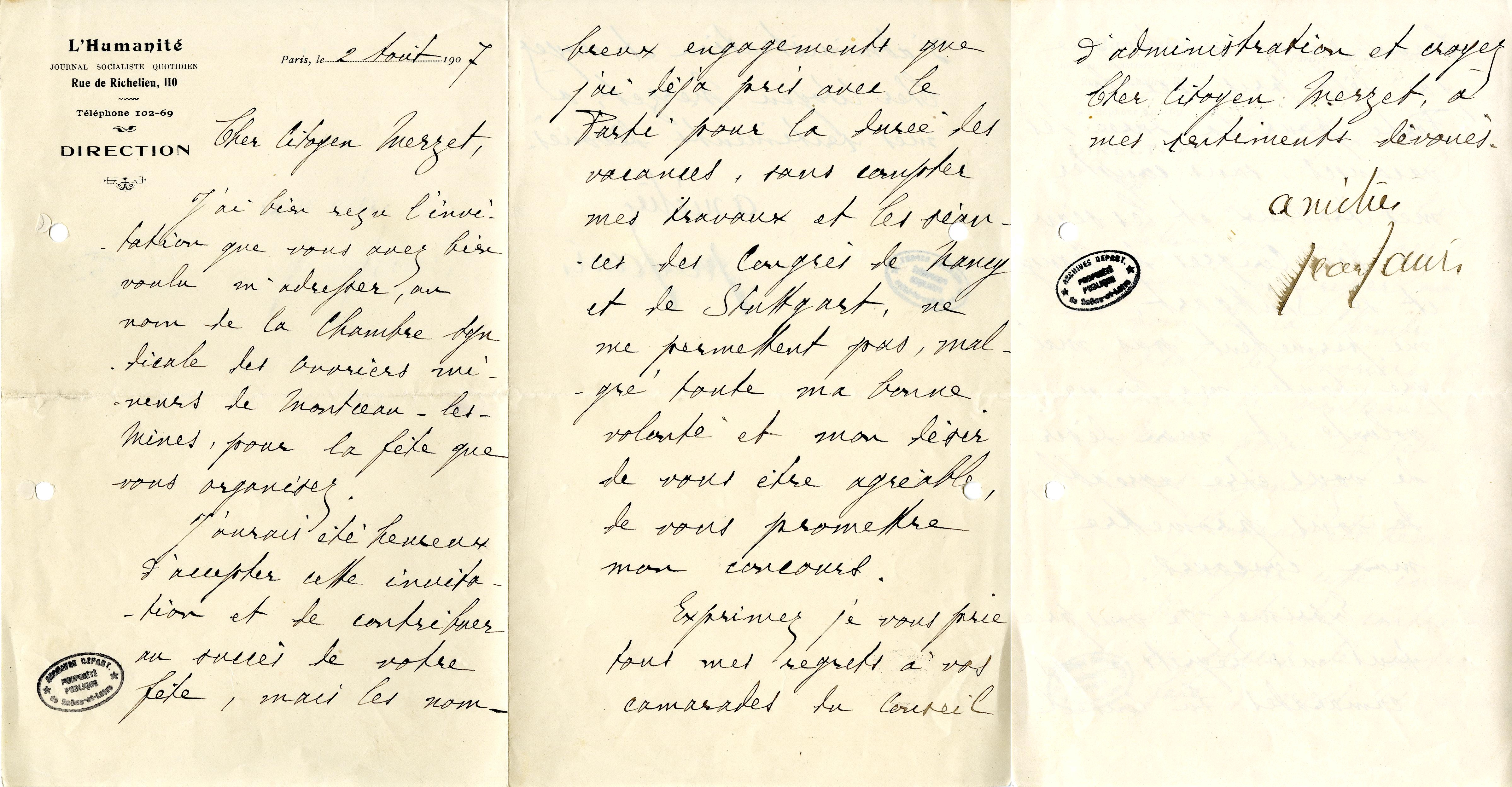 Le 2 août 1907, il prend sa plume et du papier à entête du Journal l’Humanité dont il est le Directeur, pour informer le citoyen Merzet qu’il ne pourra se rendre à la fête organisée par les ouvriers mineurs de Montceau-les-Mines.