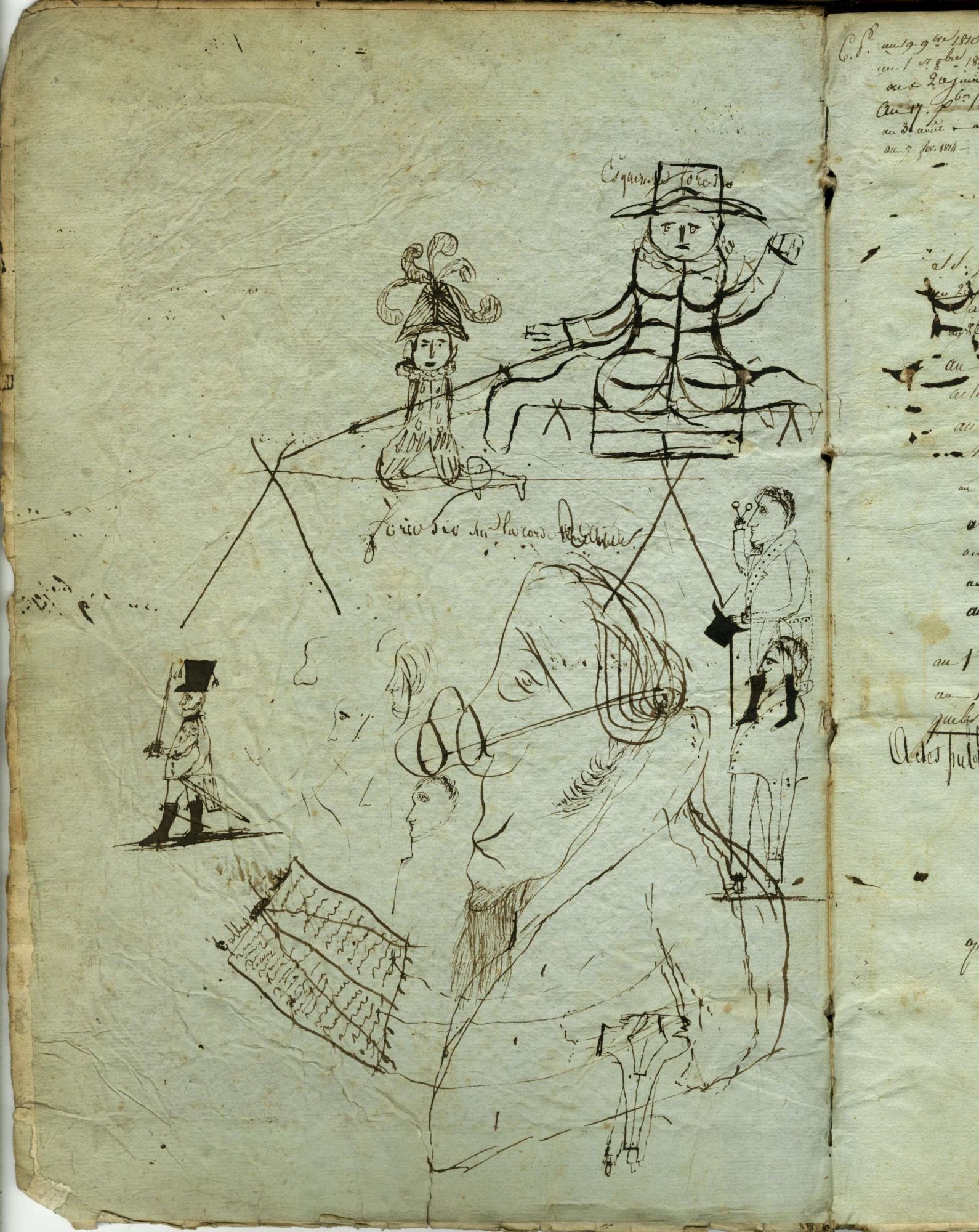 De passage à Mâcon, nul doute que le spectacle a dû impressionner les habitants car on retrouve, sur la reliure d’une table alphabétique des testaments du bureau de Mâcon (1810-1820), une représentation de « Foriosio sur la corde » mais aussi des dessins d’acrobates, d’un monsieur Loyal et d’un contorsionniste.