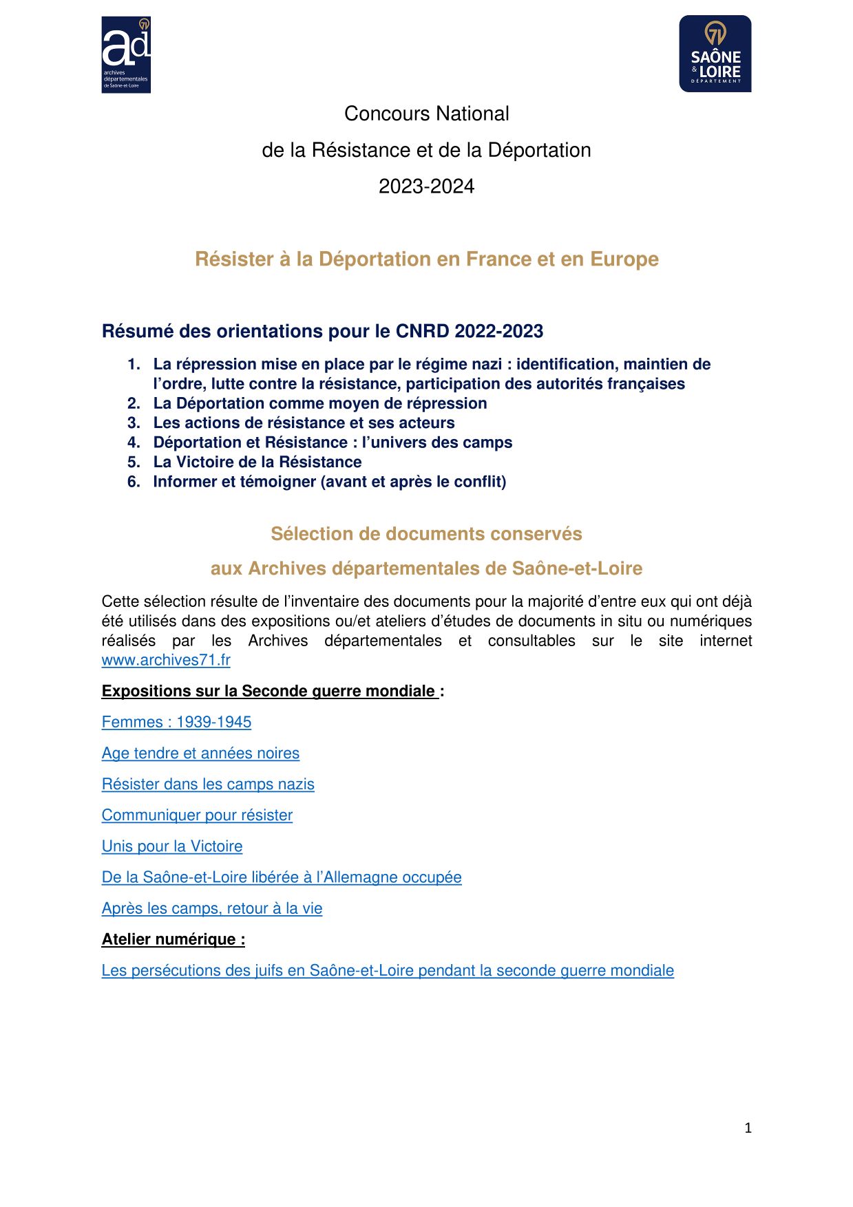 Vous trouverez dans ce dossier des exemples de documents conservés dans les fonds conservés aux Archives départementales 71, sélectionnés l'équipe du service éducatif des Archives départementales, sur la thématique du Concours national de la Résistance et de la Déportation 2023-2024.