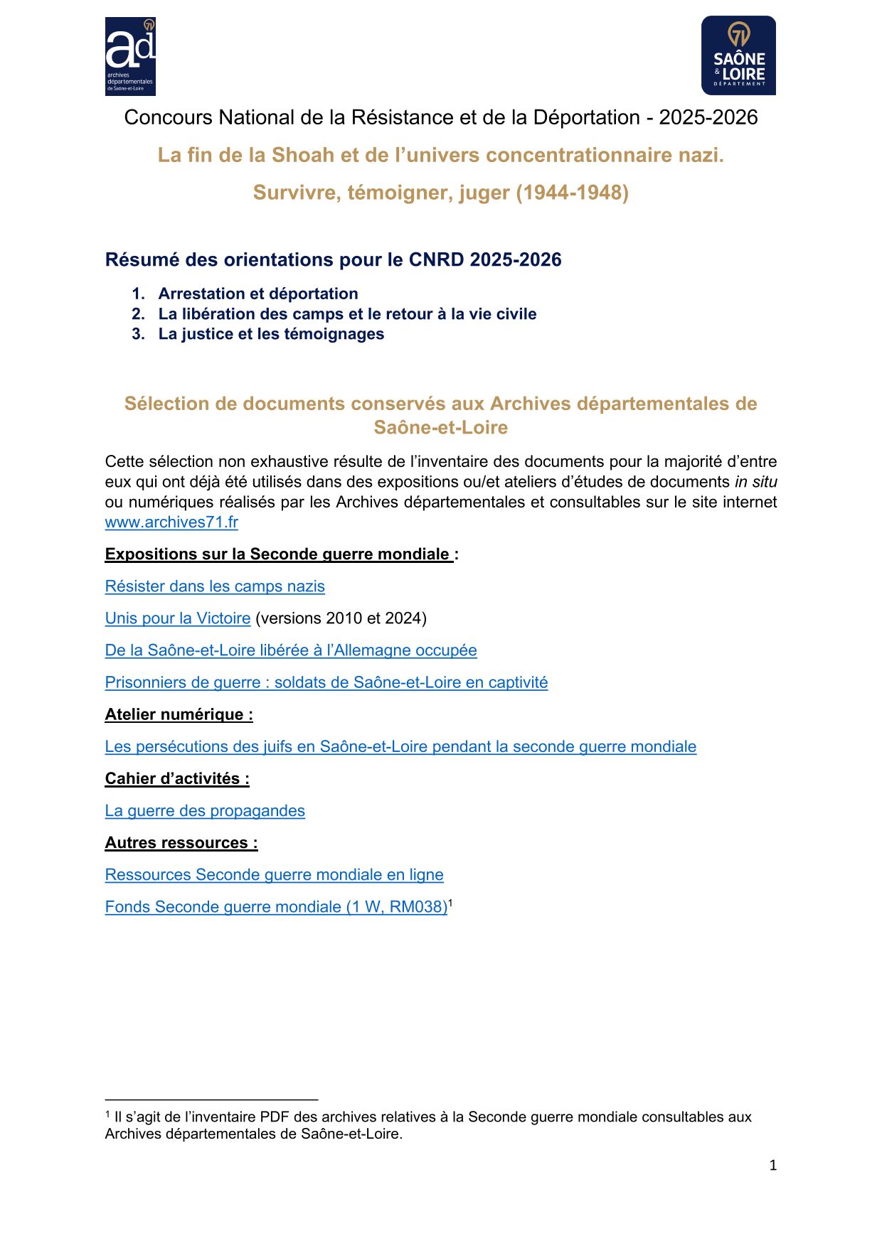 Vous trouverez dans ce dossier des exemples de documents conservés dans les fonds conservés aux Archives départementales 71, sélectionnés l'équipe du service éducatif des Archives départementales, sur la thématique du Concours national de la Résistance et de la Déportation 2025-2026.