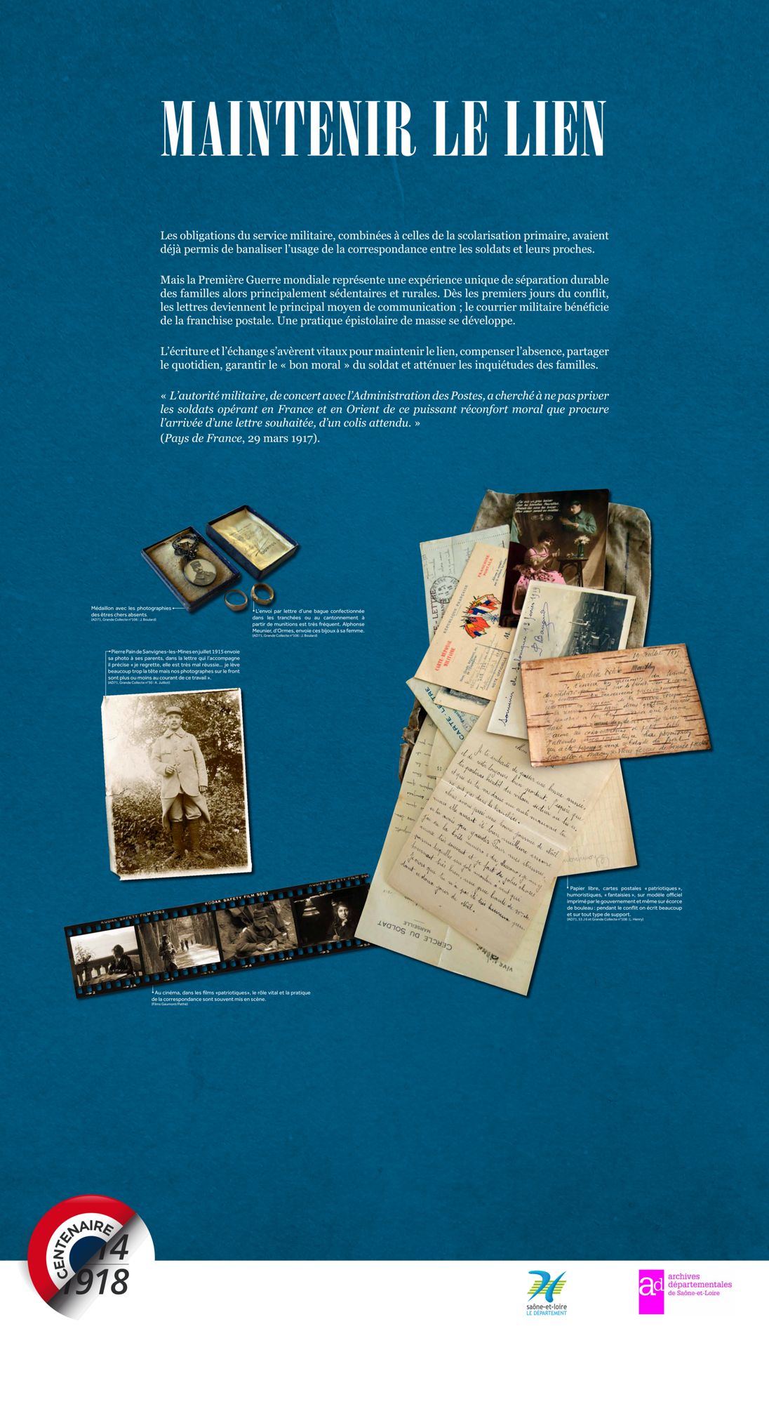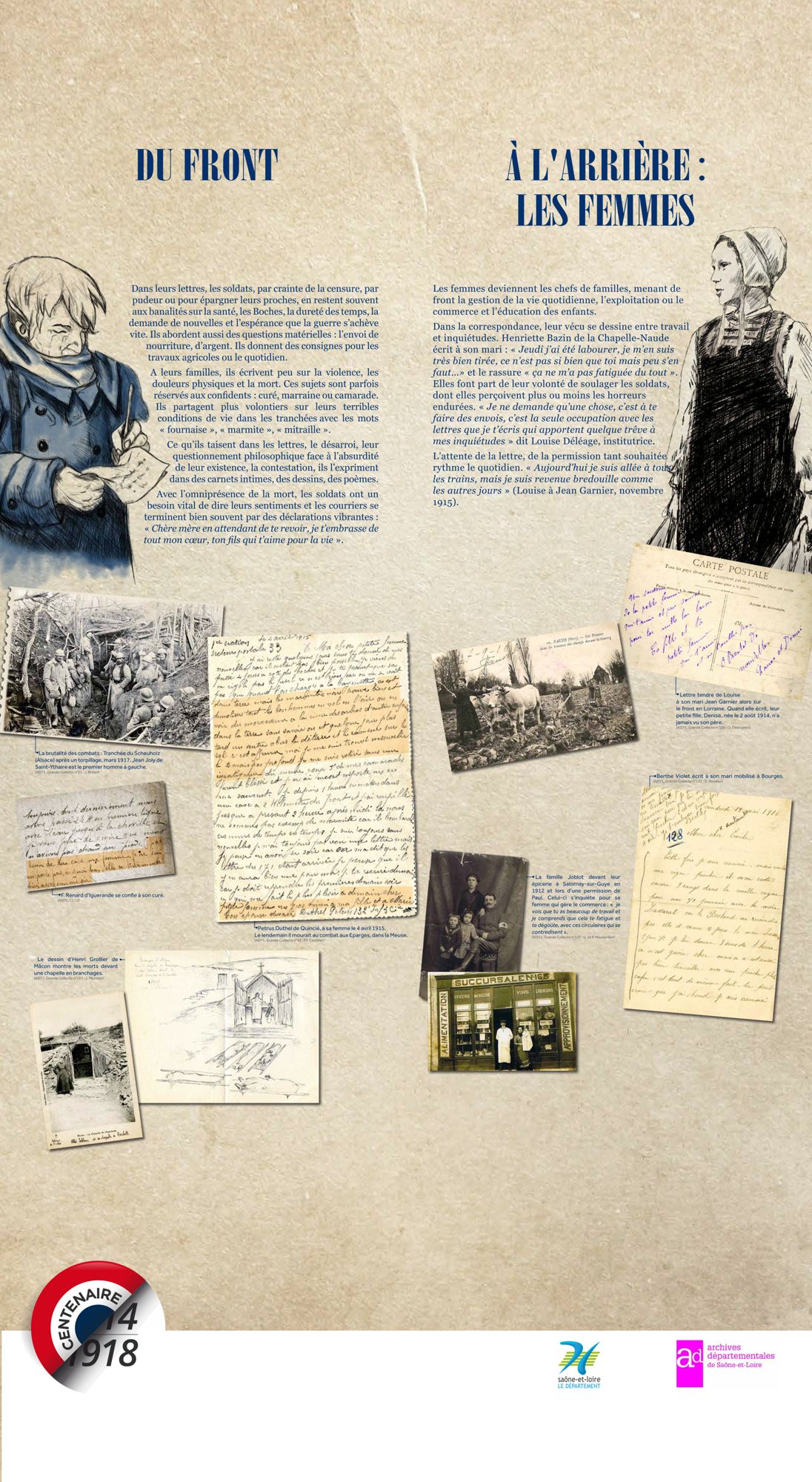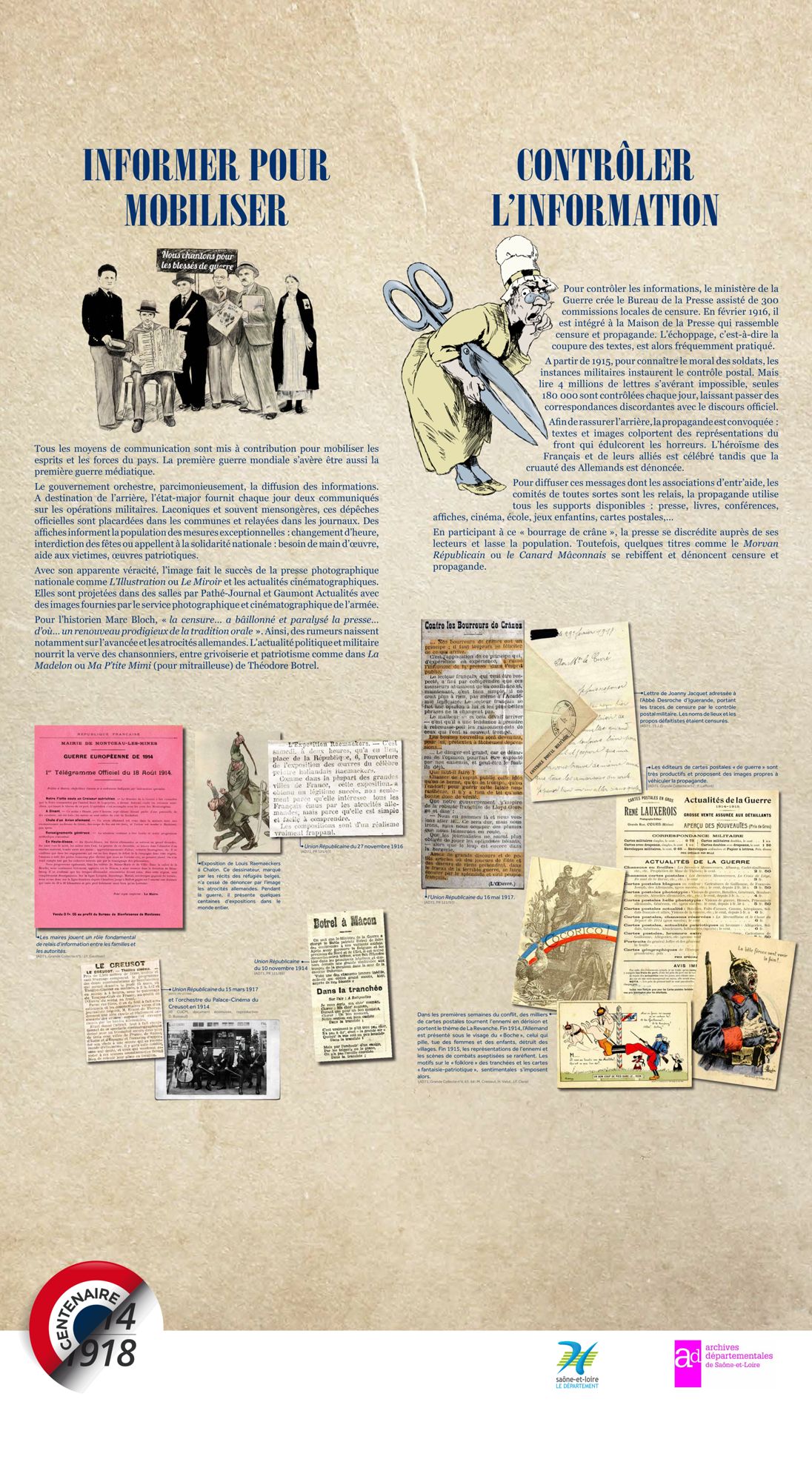 Les Archives départementales vous proposent de consulter, ci-dessous, la version itinérante de leur exposition "Nouvelles du front, échos de Saône-et-Loire" labellisée par le Ministère de la Culture dans le cadre du Centenaire de la Grande Guerre.