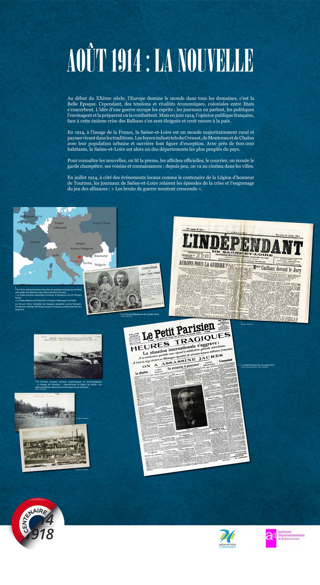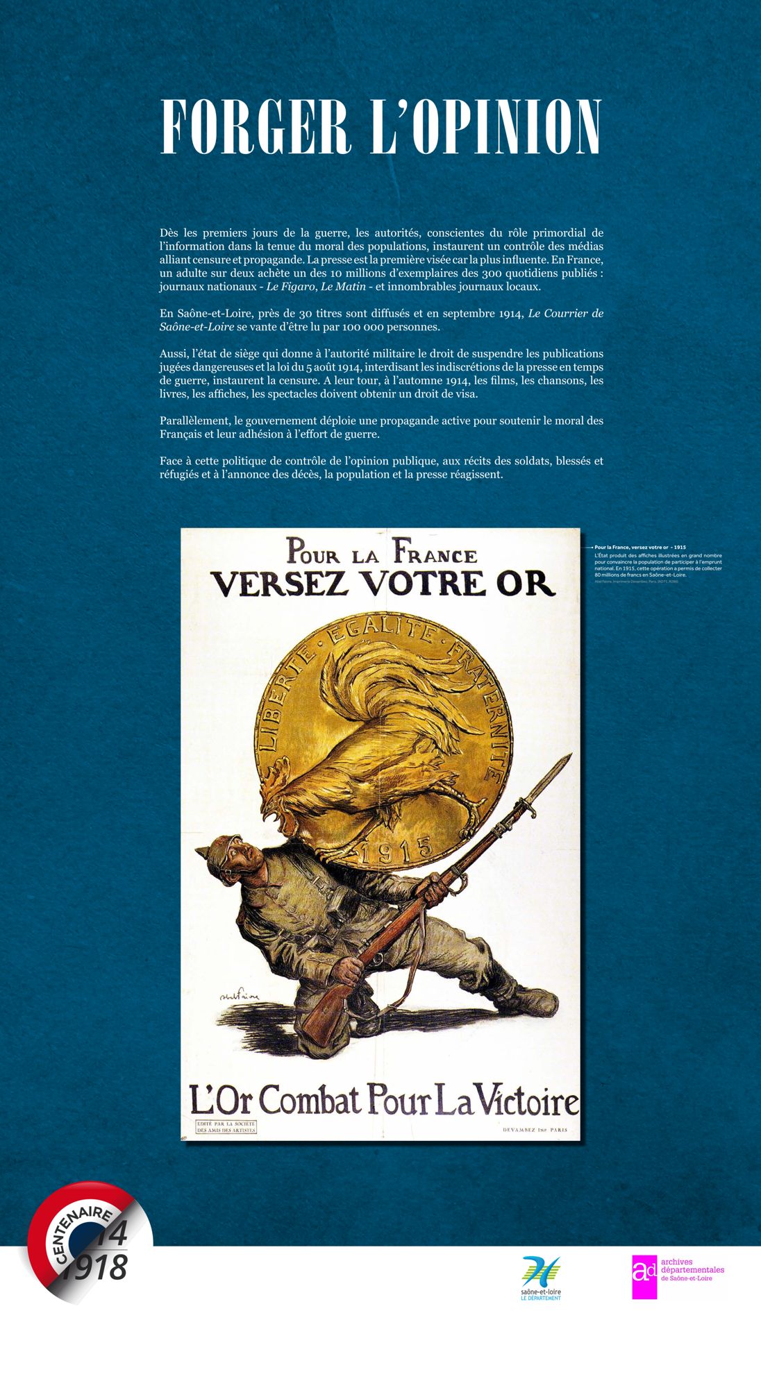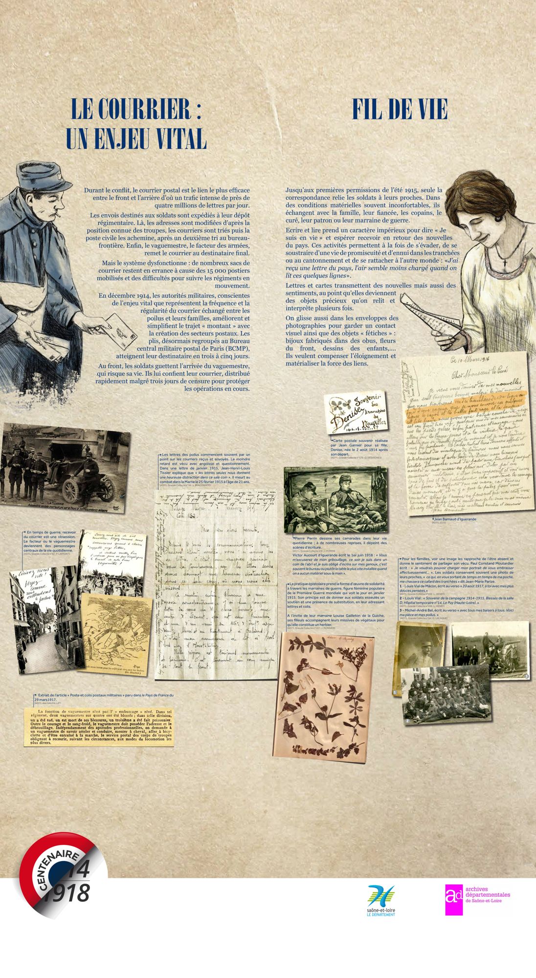 Les Archives départementales vous proposent de consulter, ci-dessous, la version itinérante de leur exposition "Nouvelles du front, échos de Saône-et-Loire" labellisée par le Ministère de la Culture dans le cadre du Centenaire de la Grande Guerre.