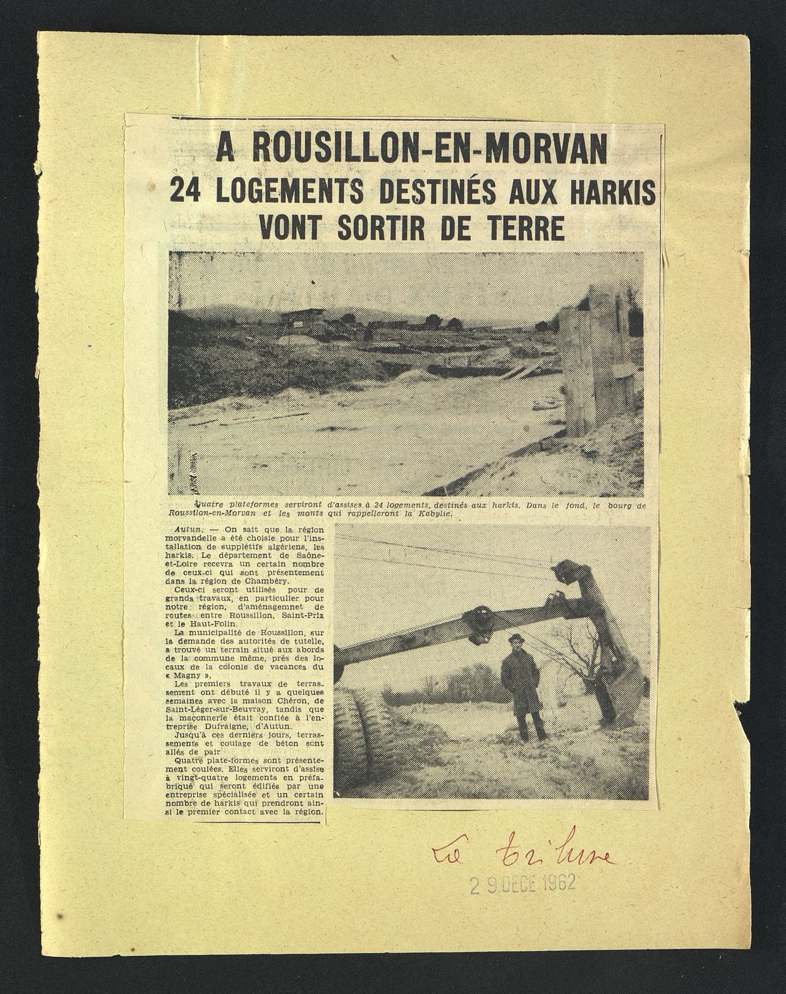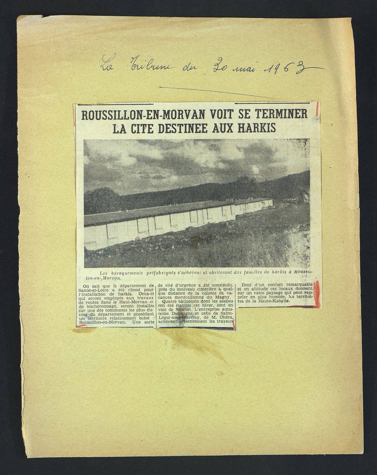 Article de presse de « La Tribune » du 30 mai 1963 dans lequel est annoncé la fin des travaux du hameau à Roussillon. Nous observons sur la photographie les baraquements préfabriqués qui ont abrité les familles de harkis. Cette « cité d’urgence » comme elle est qualifiée se situe sur une des communes les plus élevées du département et possède un territoire relativement boisé. De plus, le hameau se situe près du cimetière et possède en tout quatre bâtiments construits en partie par l’entreprise autunoise Dufraigne et celle de Saint-Léger-sous-Beuvray. En outre, l’article nous indique que « Ces locaux donnent sur un vaste paysage qui peut rappeler en plus humide, les territoires de la Haute-Kabylie. » Néanmoins, les harkis de Roussillon ne sont pas des Kabyles mais des Beni-Boudouane de l’Ouarsenis.