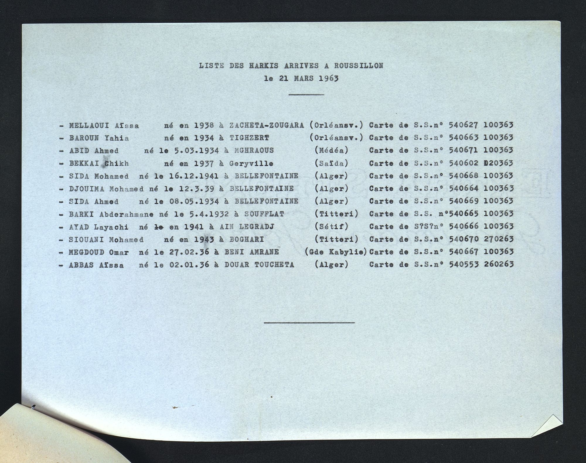 Ce document, datant du 21 mars 1963, nous indique la liste des douze harkis composant le « bataillon précurseur ». Ces derniers sont arrivés à Roussillon-en-Morvan dans le but de terminer les travaux de construction du hameau. Nous pouvons observer qu’une grande partie d’entre eux sont originaires d’Alger, mais également de Titteri, de Grande Kabylie, Saïda, Médéa ou encore Orléansville. En outre, ces harkis sont des célibataires qui ont entre 20 et 31 ans, l’État cherche ainsi à réduire le coût de construction du hameau.