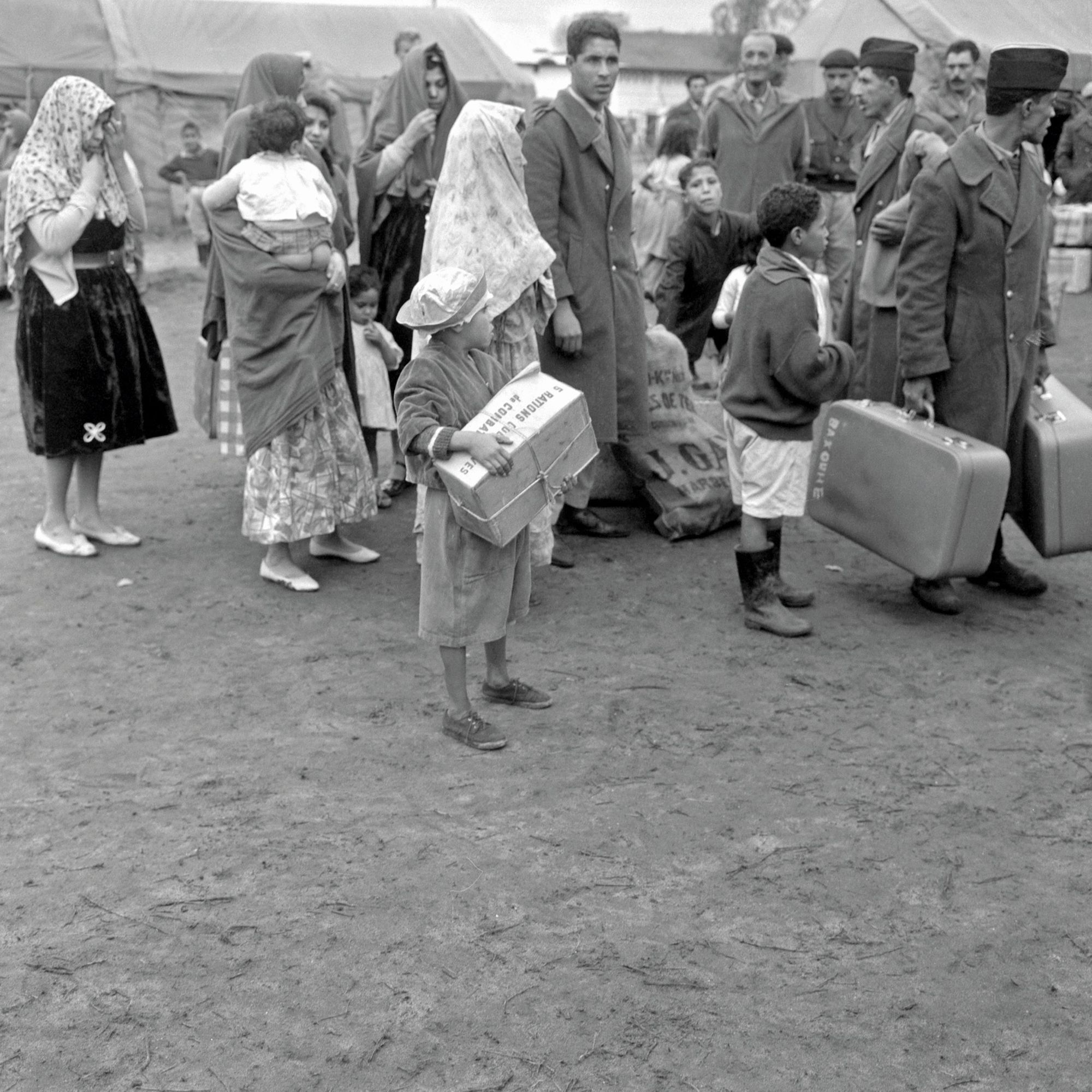 Photographie datant de novembre 1962, dans les environs de Bone : des harkis et leurs familles, bagages à la main, attendent les camions qui les emmèneront au port pour embarquer sur le paquebot Pumier. Par le biais des transferts officiels minimalistes, de ceux, clandestins, des réseaux d’officiers et de sous-officiers de l’armée française, de l’immigration économique, ou avec l’aide du Comité international de la Croix-Rouge, plusieurs dizaines de milliers de supplétifs et membres de leurs familles fuient l’Algérie pour la France, le début d’un long exil.