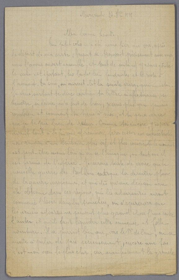 Ton petit colis m’a été remis hier au soir, après le départ de ma carte ; Poupat se trouvait précisément avec moi, nous l’avons ouvert ensemble, et tout de suite ns y avons goûté ; le cake est épatant, les brioches bien fondantes et le reste à l’avenant. Tu sais, on aurait dit la sainte vierge qui … etc. Je veux surtout te dire combien ta lettre si affectueuse, si tendre, si émue, m’a fait de bien ; je sens plus que jamais combien> et comment tu tiens à moi, et tu peux croire que je te paie bien de retour. Comme toi encore, j’aspire avant tout à la fin qui ns réunira, fera cesser nos inquiétudes, nous rendra à un bonheur plus vif et plus conscient le moment est peut-être moins loin qu’on se l’imagine, en tout cas il est permis de l’espérer. Je serai tenté de croire que la nouvelle guerre des Balkans marque la dernière phase de la guerre européenne, et que dès qu’une décision aura été obtenue dans ces régions, que les adversaires auront commencé l’hiver dans les tranchées, on s’apercevra que les armées adverses ne peuvent plus grand-chose l’une contre l’autre, et qu’il faut liquider cette immense et folle aventure. Il se pourrait bien que, vers le 1er de l’an, on se mette à parler de paix sérieusement ; encore une fois c’est mon vœu le plus cher ; car manifestement la grande