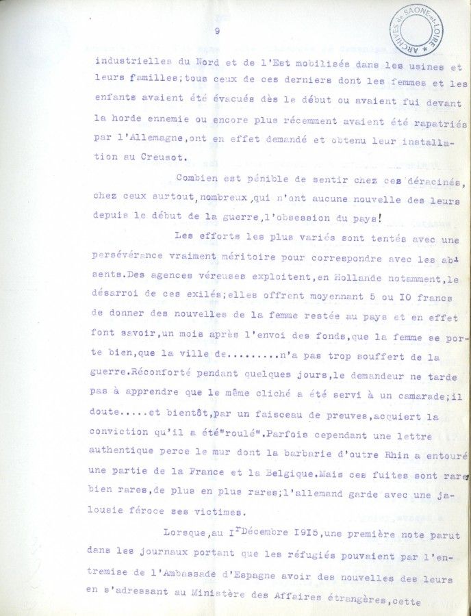 industrielles du Nord et de l'Est mobilisés dans les usines et leurs familles ; tous ceux de ces derniers dont les femmes et les enfants avaient été évacués dès le début ou avaient fui devant la horde ennemie ou encore plus récemment avaient été rapatriés par l'Allemagne, ont en effet demandé et obtenu leur installation au Creusot. Combien est pénible de sentir chez ces déracinés, chez ceux surtout, nombreux, qui n'ont aucune nouvelle des leurs depuis le début de la guerre, l'obsession du pays ! Les efforts les plus variés sont tentés avec une persévérance vraiment méritoire pour correspondre avec les absents. Des agences véreuses exploitent, en Hollande notamment, le désarroi de ces exilés ; elles offrent moyennant 5 ou 10 francs de donner des nouvelles de la femme restée au pays et en effet font savoir, un mois après l'envoi des fonds, que la femme se porte bien, que la ville de......... n'a pas trop souffert de la guerre. Réconforté pendant quelques jours, le demandeur ne tarde pas à apprendre que le même cliché a été servi à un camarade ; il doute..... et bientôt, par un faisceau de preuves, acquiert la conviction qu'il a été " roulé ". Parfois cependant une lettre authentique perce le mur dont la barbarie d'outre Rhin a entouré une partie de la France et la Belgique. Mais ces fuites sont rares, bien rares, de plus en plus rares ; l'allemand garde avec une jalousie féroce ses victimes. Lorsque, au 1er décembre 1915, une première note parut dans les journaux portant que les réfugiés pouvaient par l'entremise de l'Ambassade d'Espagne avoir des nouvelles des leurs en s'adressant au Ministère des Affaires étrangères, cette