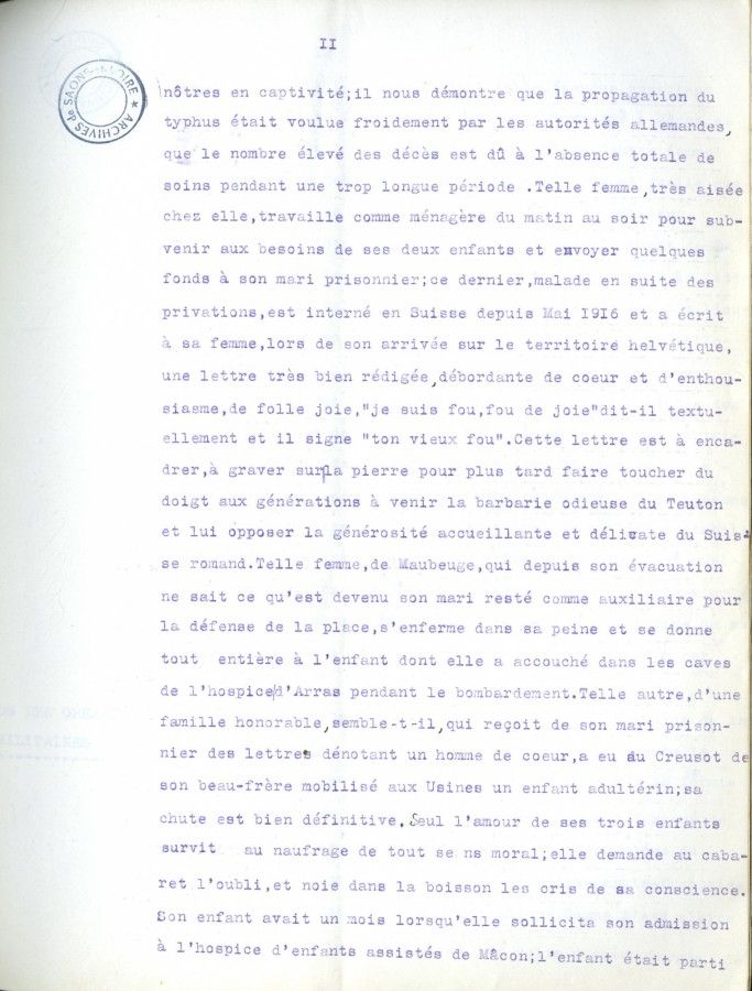 des nôtres en captivité ; il nous démontre que la propagation du typhus était voulue froidement par les autorités allemandes, que le nombre élevé des décès est dû à l'absence totale de soins pendant une trop longue période. Telle femme, très aisée chez elle, travaille comme ménagère du matin au soir pour subvenir aux besoins de ses deux enfants et envoyer quelques fonds à son mari prisonnier ; ce dernier, malade en suite des privations, est interné en Suisse depuis mai 1916 et a écrit à sa femme, lors de son arrivée sur le territoire helvétique, une lettre très bien rédigée, débordante de coeur et d'enthousiasme, de folle joie, " je suis fou, fou de joie " dit-il textuellement et il signe " ton vieux fou ". Cette lettre est à encadrer, à graver sur la pierre pour plus tard faire toucher du doigt aux générations à venir la barbarie odieuse du Teuton et lui opposer la générosité accueillante et délicate du Suisse romand. Telle femme, de Maubeuge, qui depuis son évacuation ne sait ce qu'est devenu son mari resté comme auxiliaire pour la défense de la place, s'enferme dans sa peine et se donne tout entière à l'enfant dont elle a accouché dans les caves de l'hospice d'Arras pendant le bombardement. Telle autre, d'une famille honorable, semble-t-il, qui reçoit de son mari prisonnier des lettres dénotant un homme de coeur, a eu au Creusot de son beau-frère mobilisé aux usines un enfant adultérin ; sa chute est bien définitive. Seul l'amour de ses trois enfants survit au naufrage de tout sens moral ; elle demande au cabaret l'oubli, et noie dans la boisson les cris de sa conscience. Son enfant avait un mois lorsqu'elle sollicite son admission à l'hospice d'enfants assistés de Mâcon ; l'enfant était parti