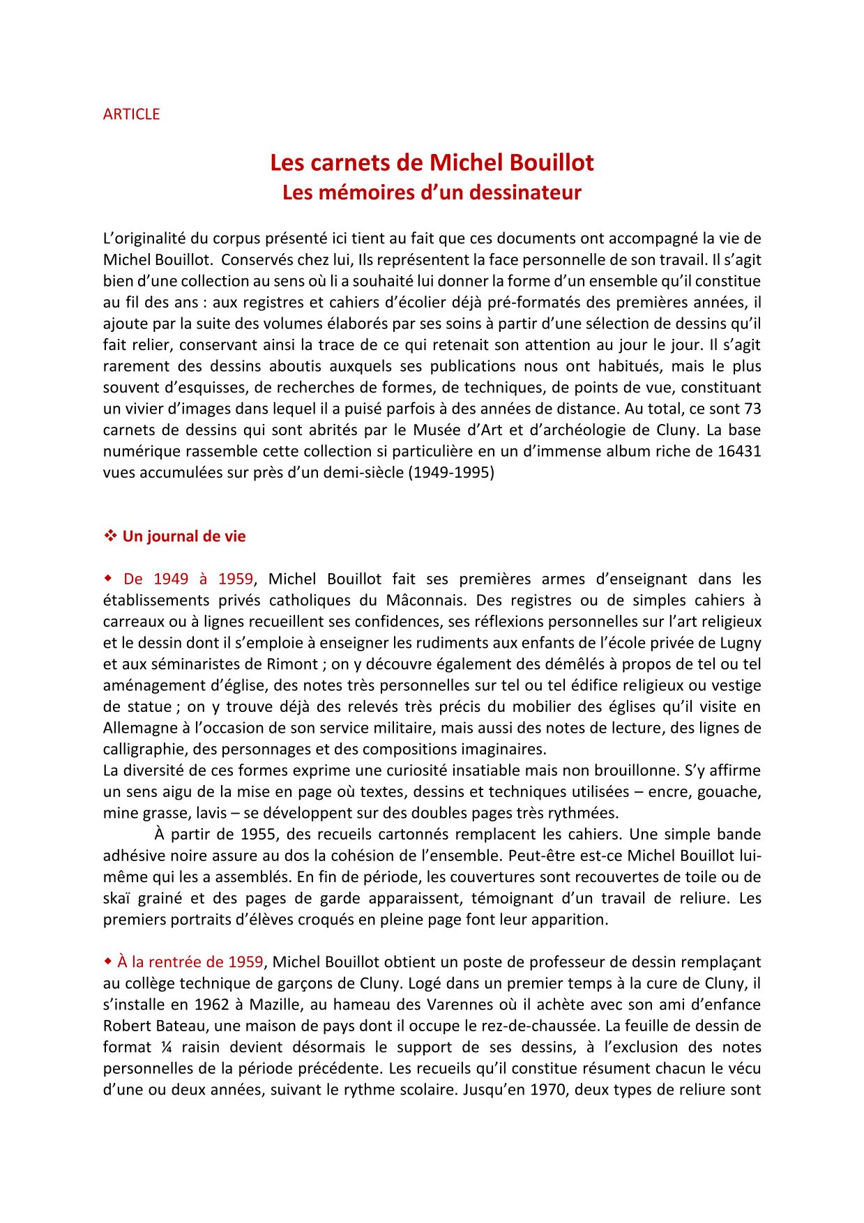 L’association « les Amis de Michel Bouillot », en partenariat avec la ville de Cluny, le conseil départemental et la DRAC, a souhaité porter au plus grand nombre les quelque 16431 pages qu’ils recèlent, révélant des aspects moins connus de son abondante production et la variété de ses centres d’intérêt.
