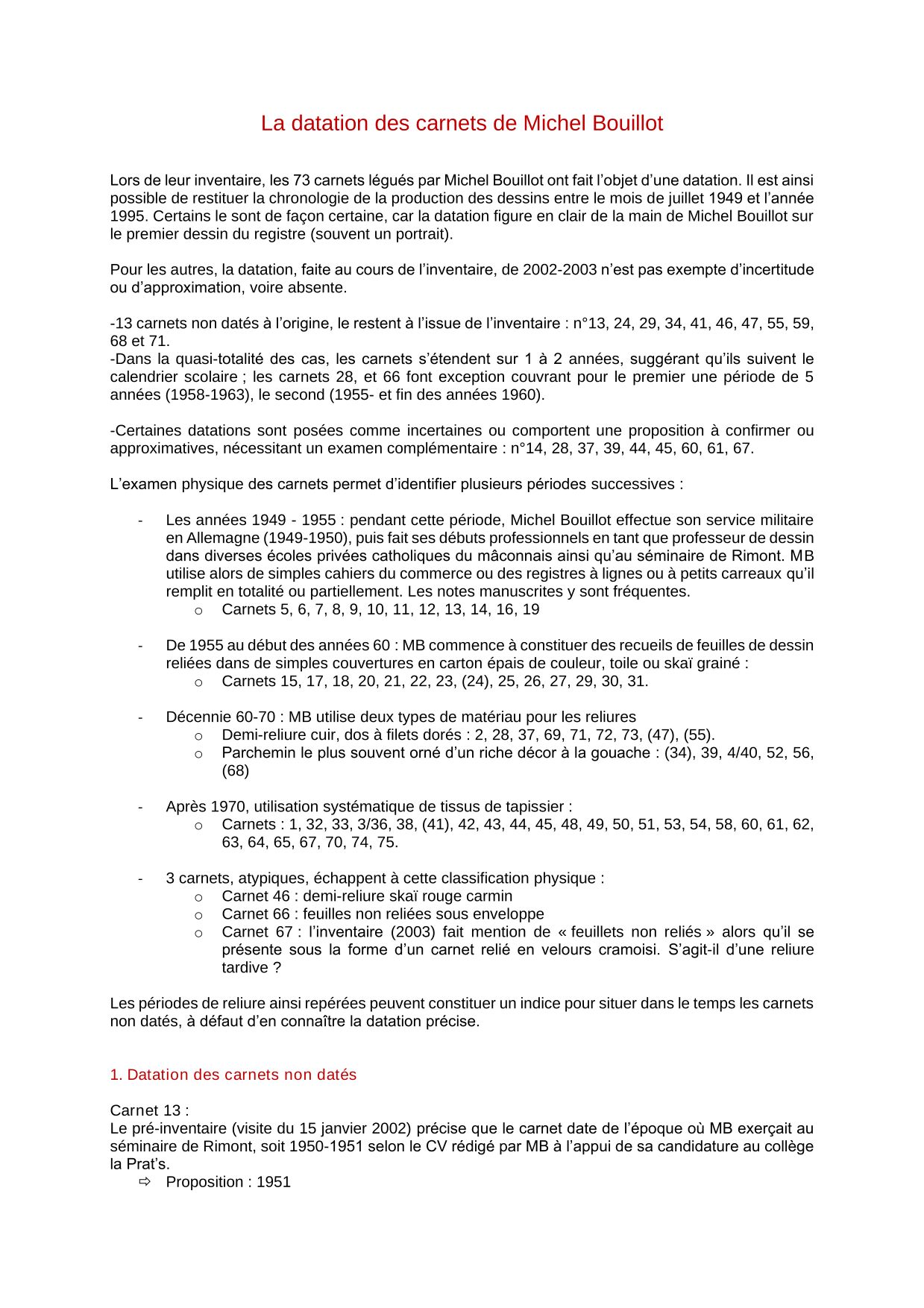 En 1990, Michel Bouillot lègue par testament une collection de carnets et de cahiers de dessins à ce qui était alors le Musée Ochier de Cluny. Il s’agissait de dessins conservés à titre personnel, réalisés par l’artiste entre 1949 et 1995 pour les plus récents d’entre eux. À la différence des dessins aboutis bien connus des habitants de Saône-et-Loire édités par les Foyers Ruraux entre 1988 et 2002, ces carnets donnent un aperçu de ce qui retenait au jour le jour l’attention de l’artiste.