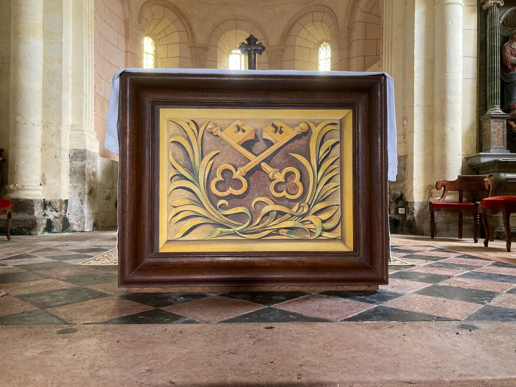 Pour cet autel peint, Michel Bouillot ne retient pas un mantra issu des Écritures. Les deux clés en sautoir se détachent sur un blason dont la forme est suggérée par deux larges palmes, référence directe aux clefs de saint Pierre, patron de l'église, et à son martyre. La présentation des clefs rappelle celle du le blason de l'abbaye de Cluny.